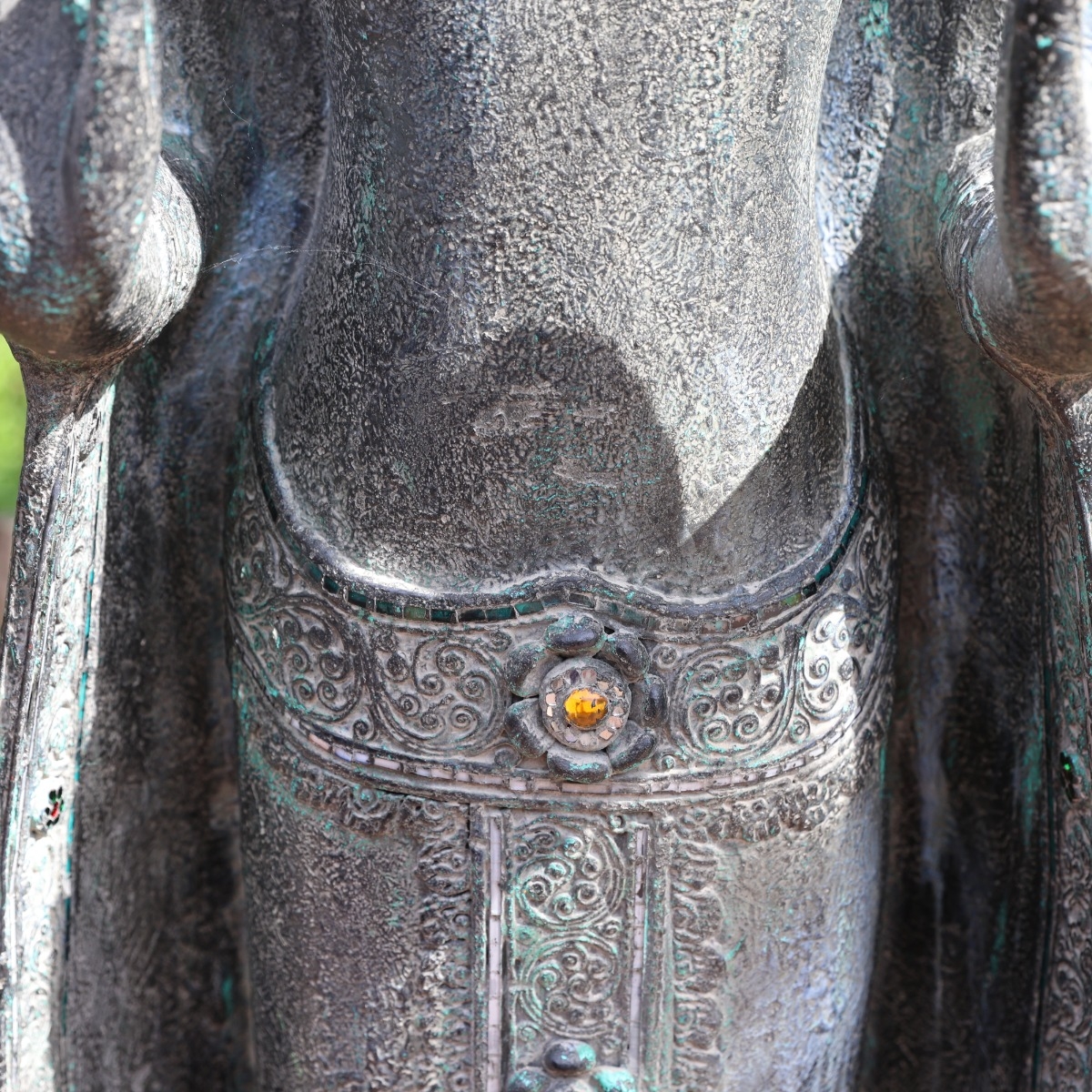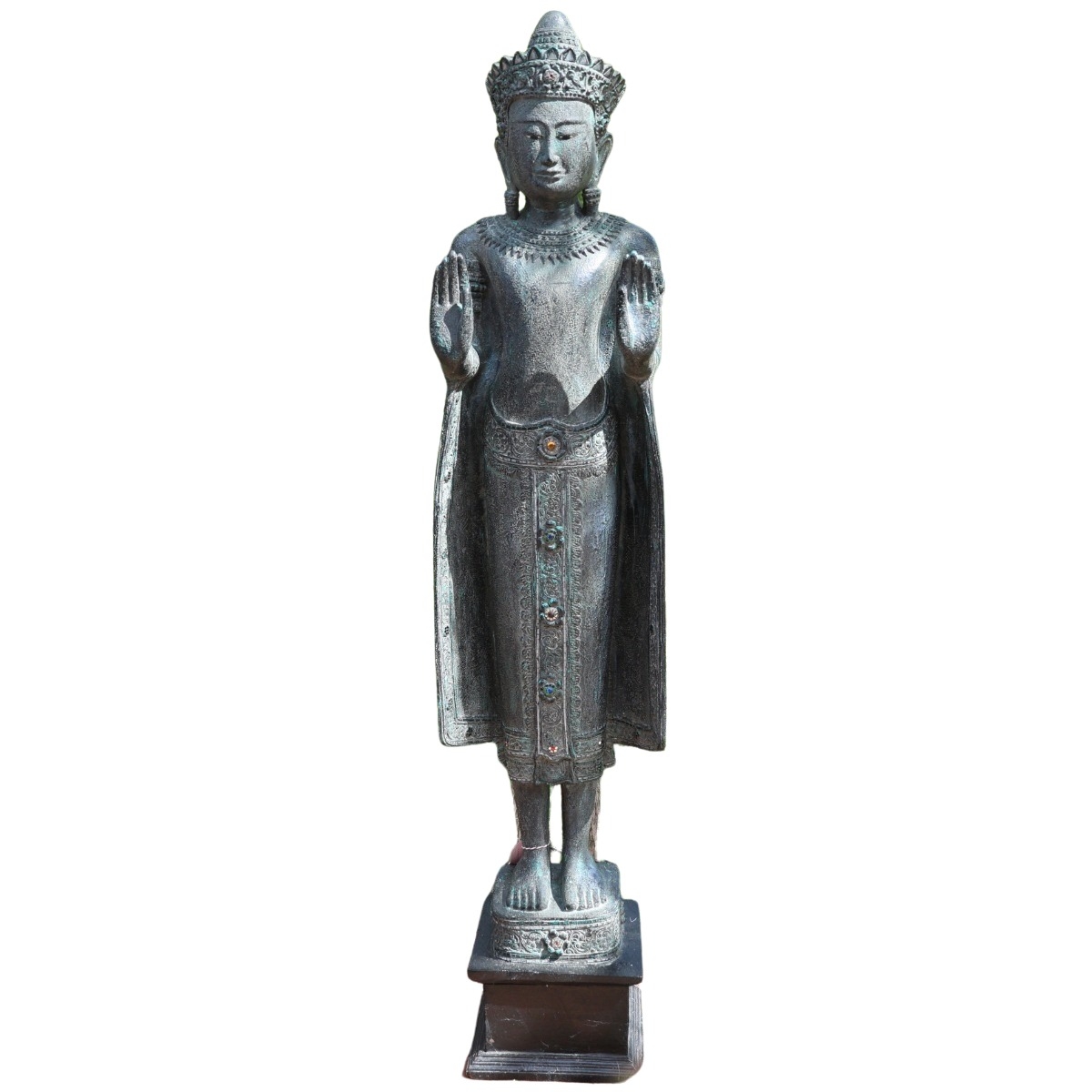 Mit beiden Händen zeigt dieser Buddha das Abhaya Mudra, welches unter anderem für Furchtlosigkeit und Ermutigung steht. Dem Mythos nach hat Buddha einen über die Ufer tretenden Fluss mit dieser Geste wieder in seine Bahnen gelenkt.