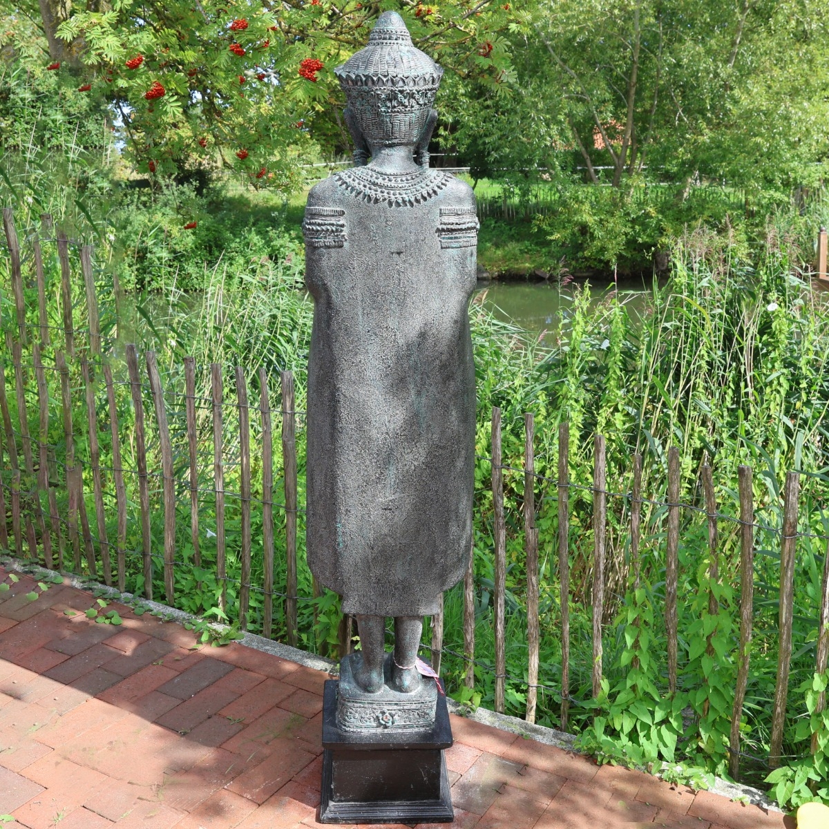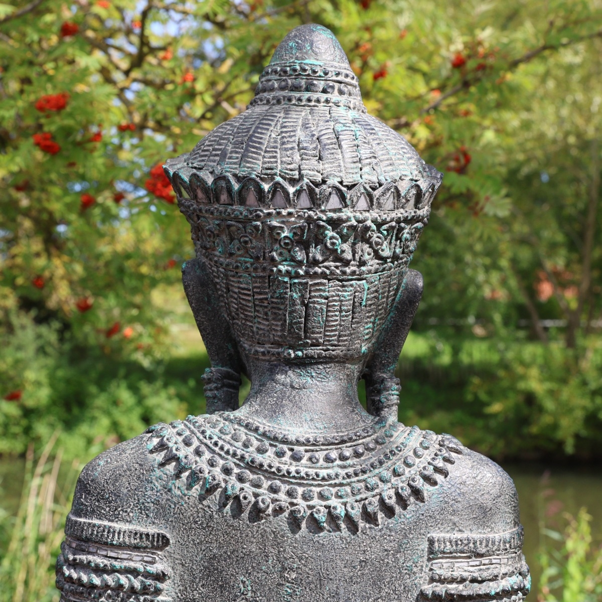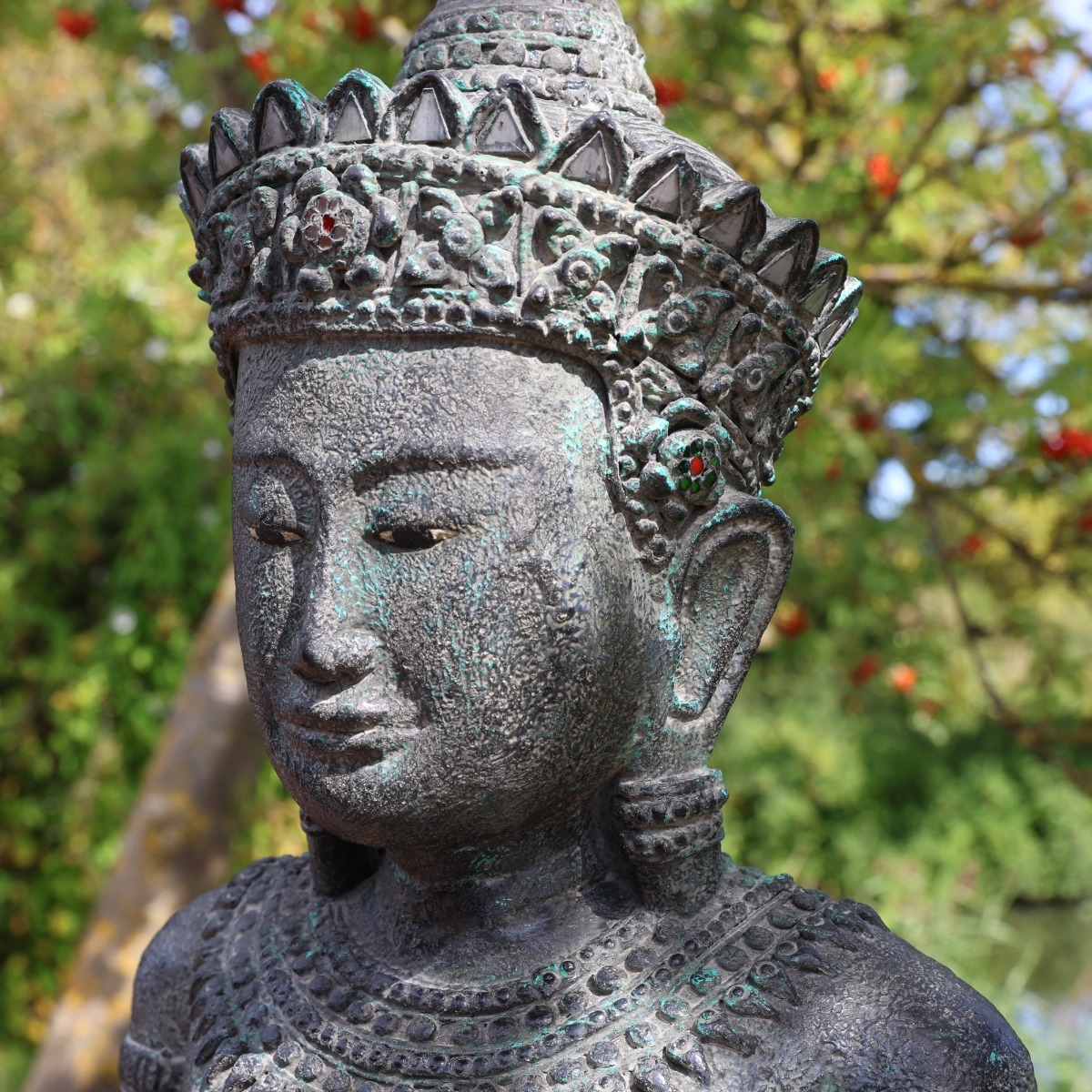 Diese Skulptur in einem angenehmen dunklen Grün ist handgeschnitzt und koloriert. Sein Gewand setzt sich durch eine hellere Färbung vom Körper ab und ist mit kleinen Spiegeln und Strasssteinen besetzt. Die Buddhafigur ist eine spirituelle Erweiterung für Ihr Zuhause und wird nicht nur dank der eindrucksvollen Größe zu einem echten Blickfang.