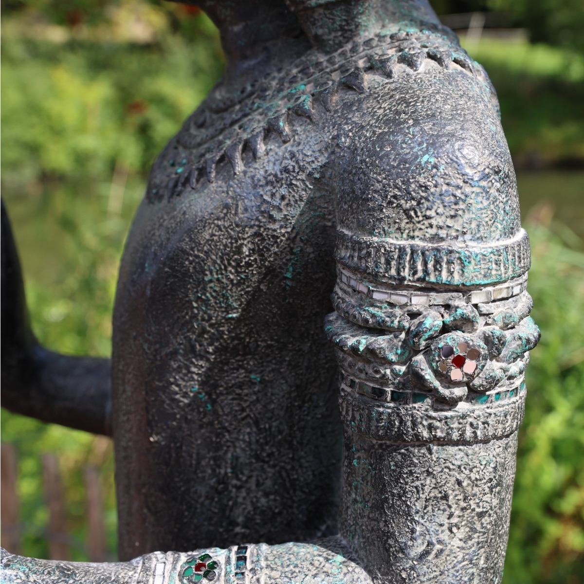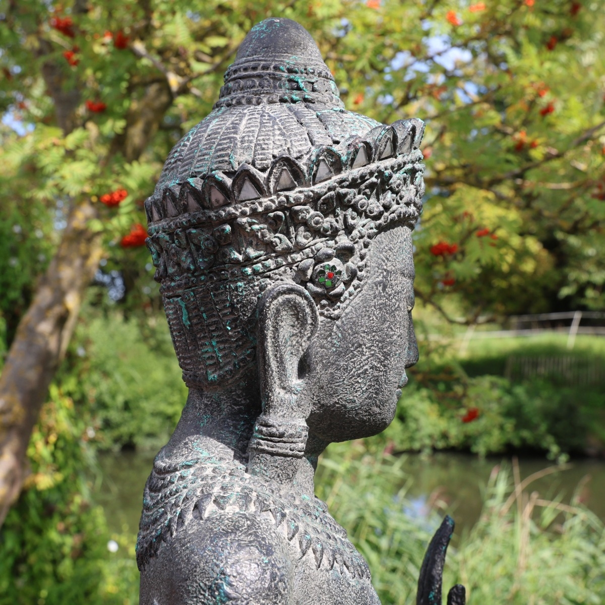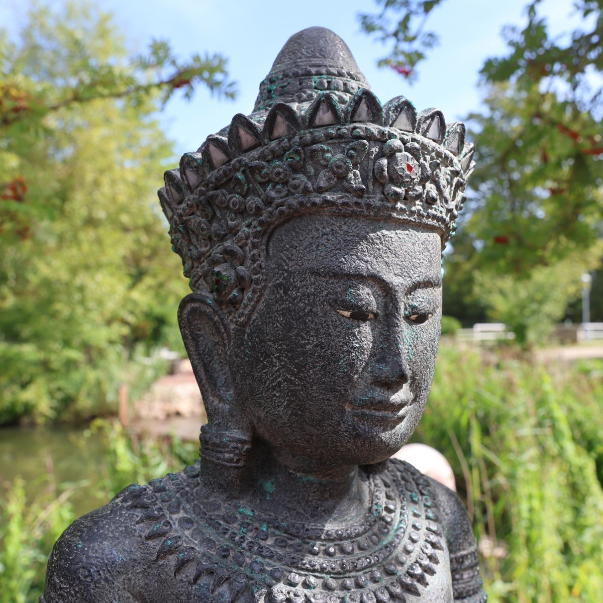 Diese Skulptur in einem angenehmen dunklen Grün ist handgeschnitzt und koloriert. Sein Gewand setzt sich durch eine hellere Färbung vom Körper ab und ist mit kleinen Spiegeln und Strasssteinen besetzt. Die Buddhafigur ist eine spirituelle Erweiterung für Ihr Zuhause und wird nicht nur dank der eindrucksvollen Größe zu einem echten Blickfang.