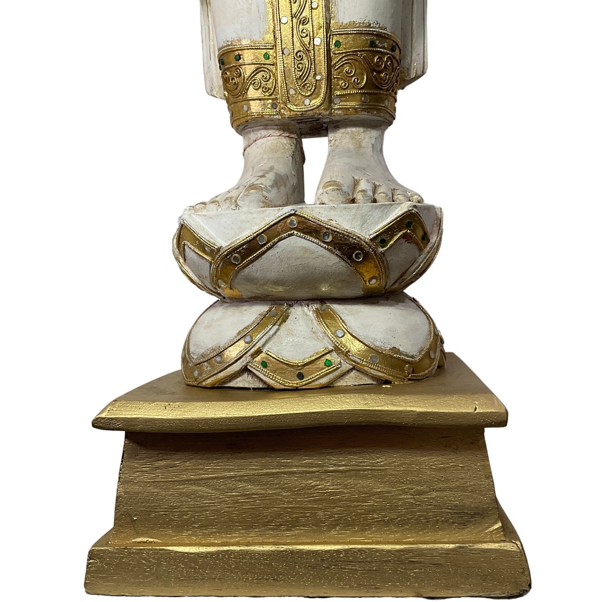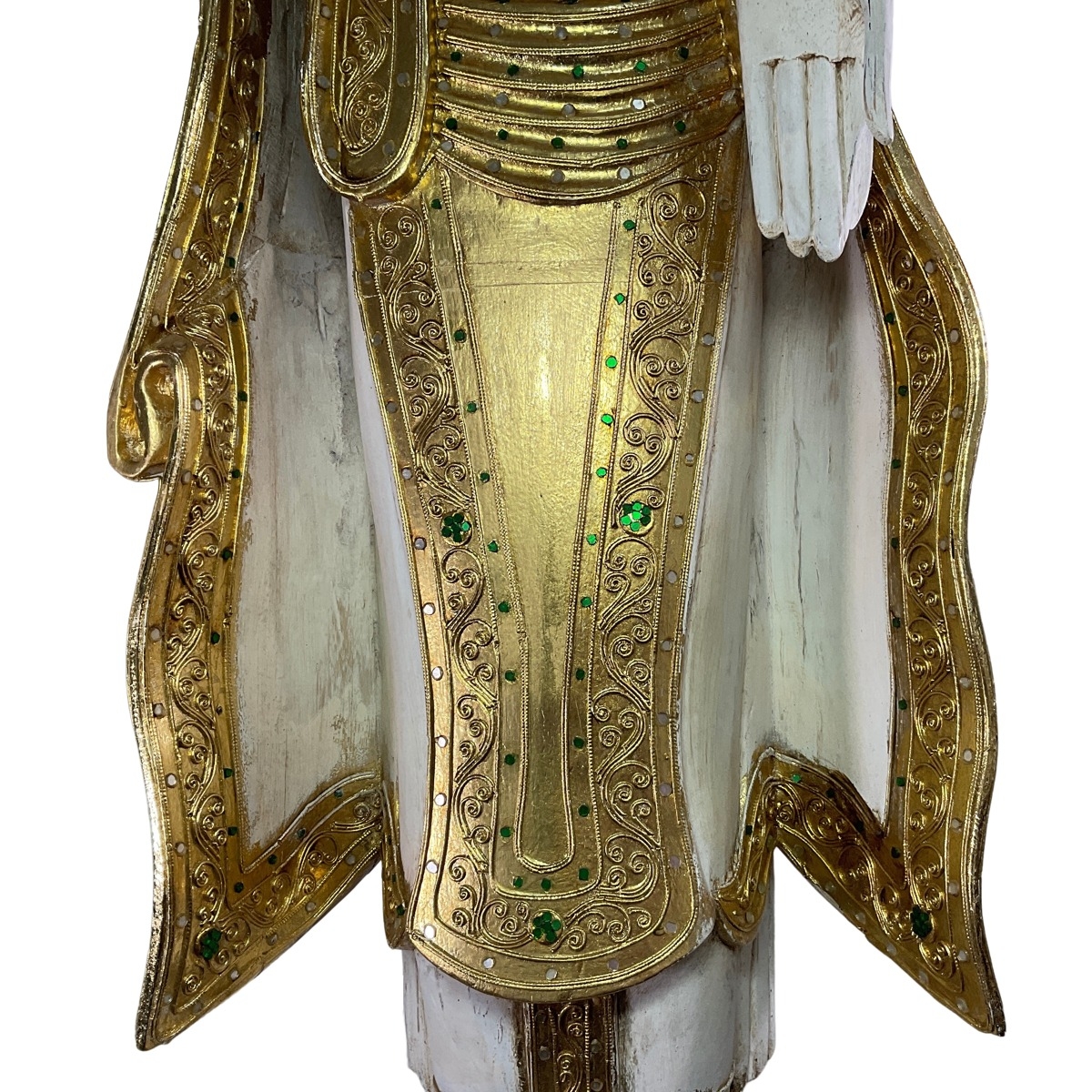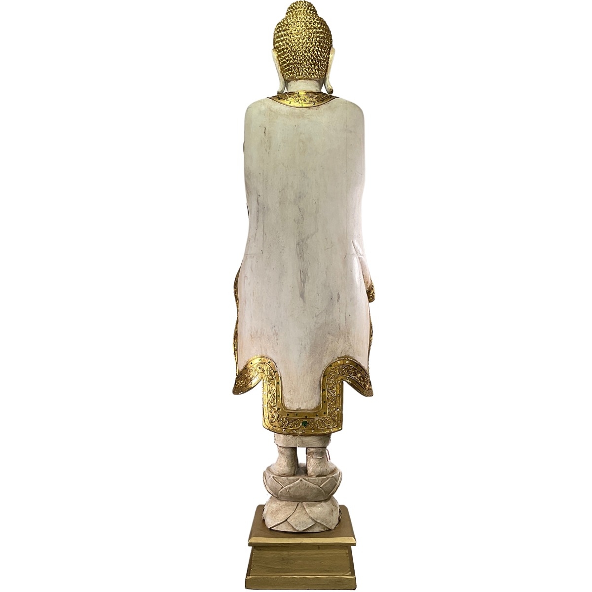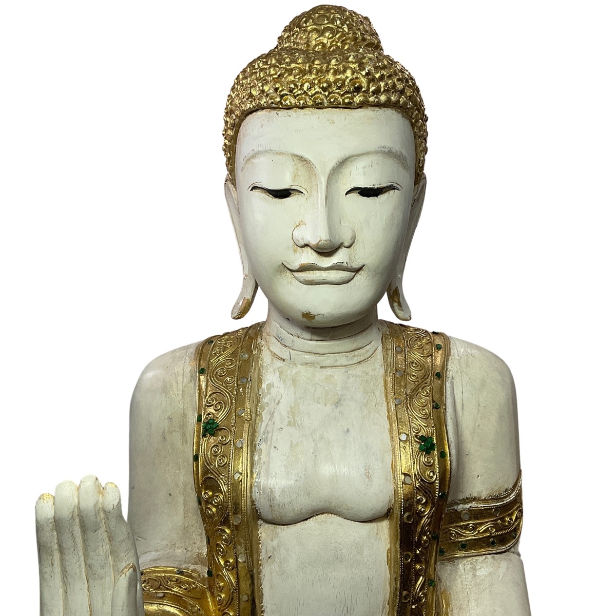 Die Abhaya Mudra, welche dieser Buddha zeigt, steht für Furchtlosigkeit beziehungsweise die Bezwingung der eigenen Angst. Sie zeigt den Lebensabschnitt Buddhas unmittelbar nach der Erleuchtung. Diese hochwertige Holzfigur ist handgeschnitzt und mit weißer Farbe bemalt. Die goldenen Bereiche sind blattvergoldet und reich mit Spiegelsteinen besetzt.