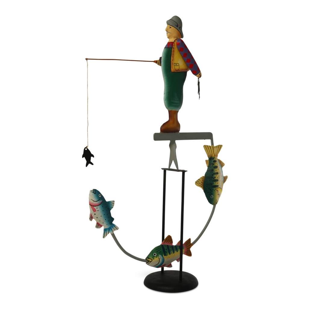 Eine liebevoll und aufwendig gearbeitete Figur eines Seemannes, der nach den drei Fischen unter ihm angelt. Die Figur hat ein robustes Design, das wunderbar zu dem fröhlichen Seebären passt, der in voller Montur den Gezeiten trotzt. Die solide Form des Pendels passt zum Motiv, und ist wie der Ständer in schwarz gehalten. Das Gegengewicht sorgt für ein langes Pendeln.