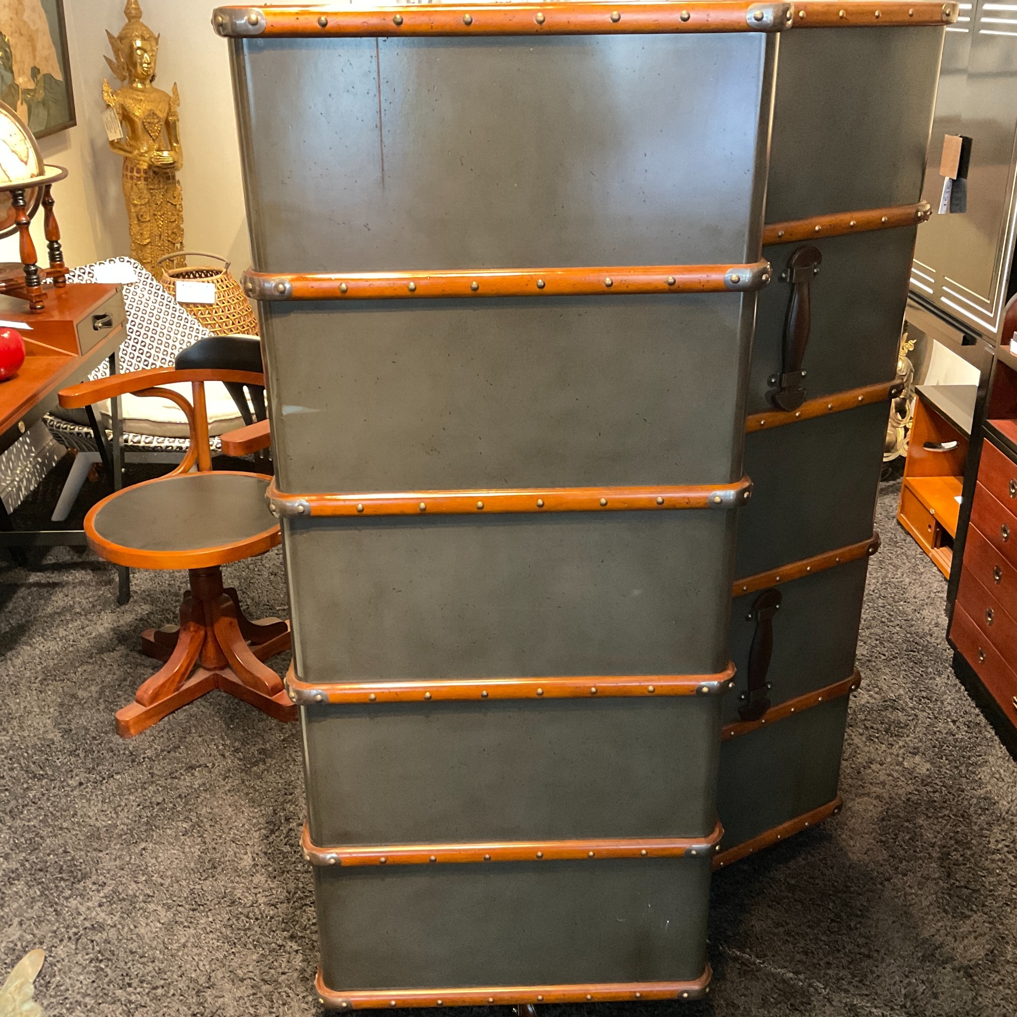 Zusammengeklappt sieht unsere mobile Bar wie ein großer, luxuriöser Reisekoffer aus, mit stabilen Fahrrollen am Boden, patinierten Messingbeschlägen in Vintageoptik und Griffen aus stabilem Leder. Eine Hommage an die Reisekoffer der Oberschicht Anfang des 20. Jahrhunderts Aussen, ein vielfältiges und praktisches Möbel im Inneren.