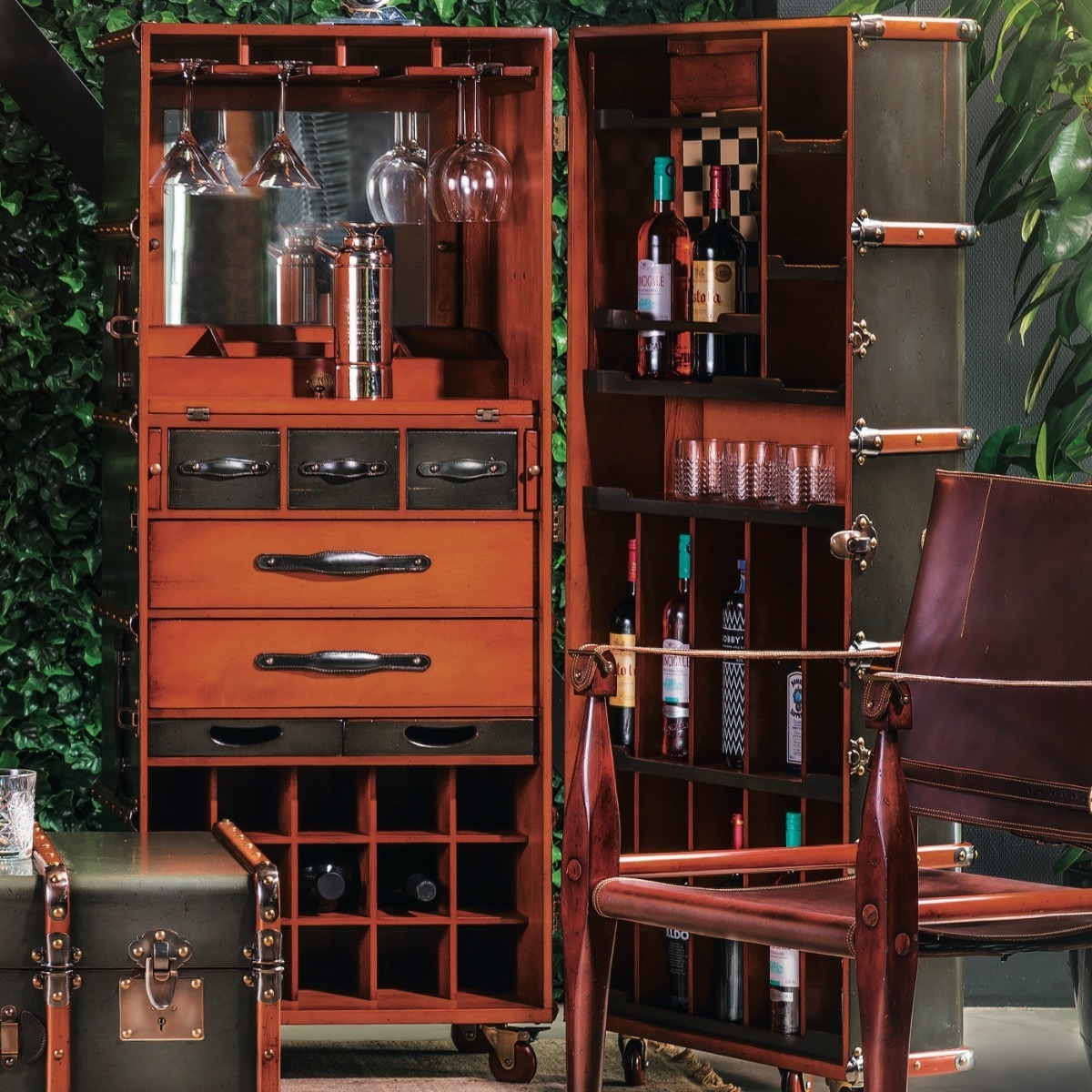 Zusammengeklappt sieht das Ganze wie ein riesiger Übersee-Koffer in Luxusausführung aus, mit stabilen Fahrrollen am Boden, grau patinierten Messingbeschlägen in Vintageoptik und stabilen Ledergriffen. Eine Hommage an die Reisekoffer der Oberschicht Anfang des 20. Jahrhunderts. Aber die Highlights liegen bei diesem Barschrank im Inneren.