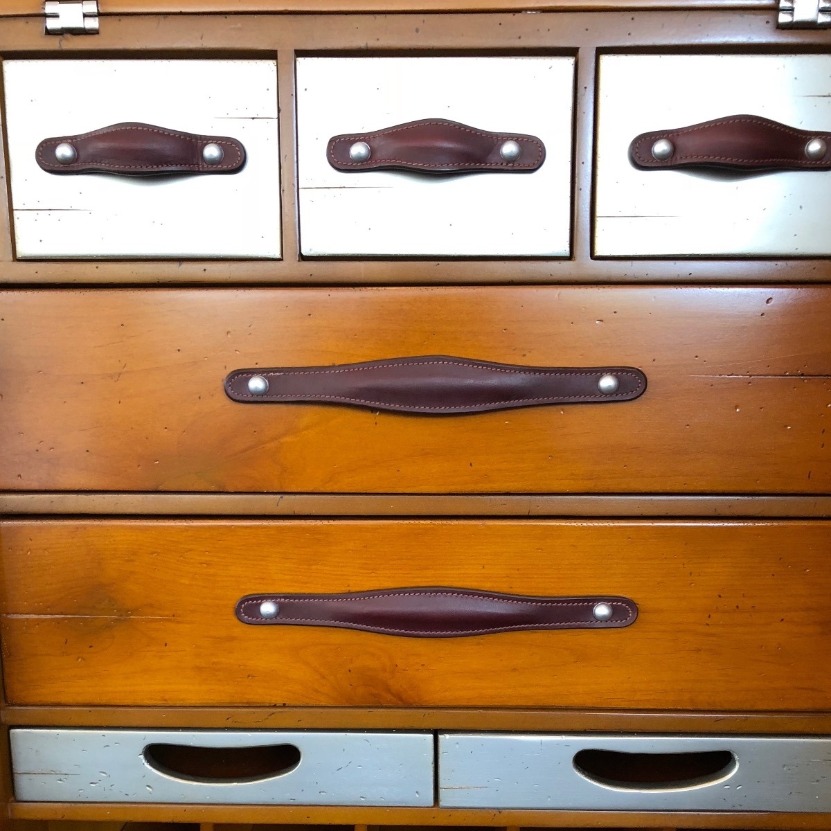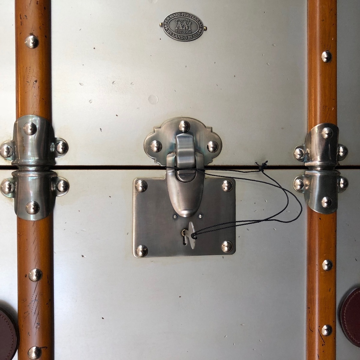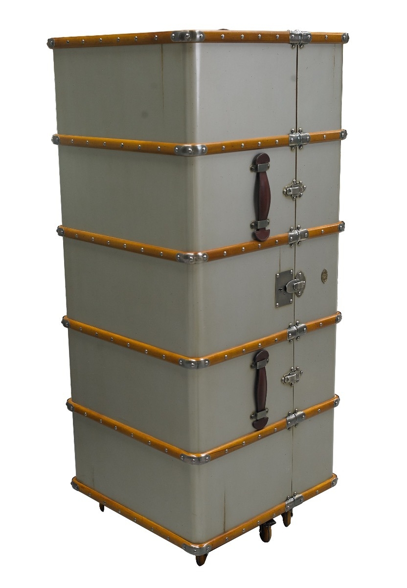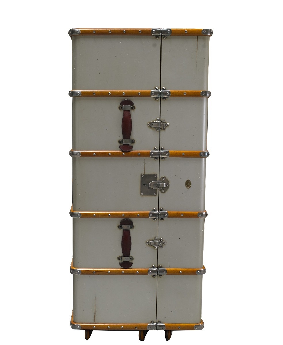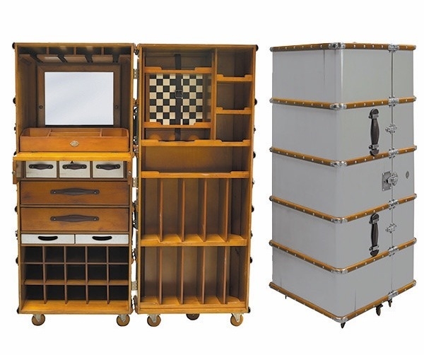 Zusammengeklappt sieht das Ganze wie ein riesiger Übersee-Koffer in Luxusausführung aus, mit stabilen Fahrrollen am Boden, grau patinierten Messingbeschlägen in Vintageoptik und stabilen Ledergriffen. Eine Hommage an die Reisekoffer der Oberschicht Anfang des 20. Jahrhunderts. Aber die Highlights liegen bei diesem Barschrank im Inneren.