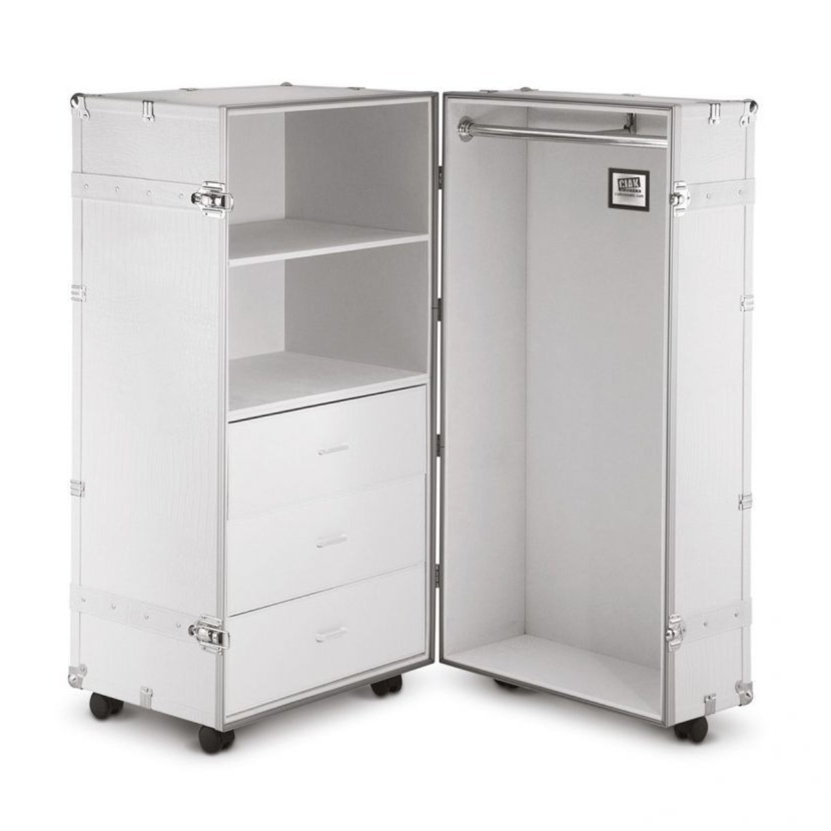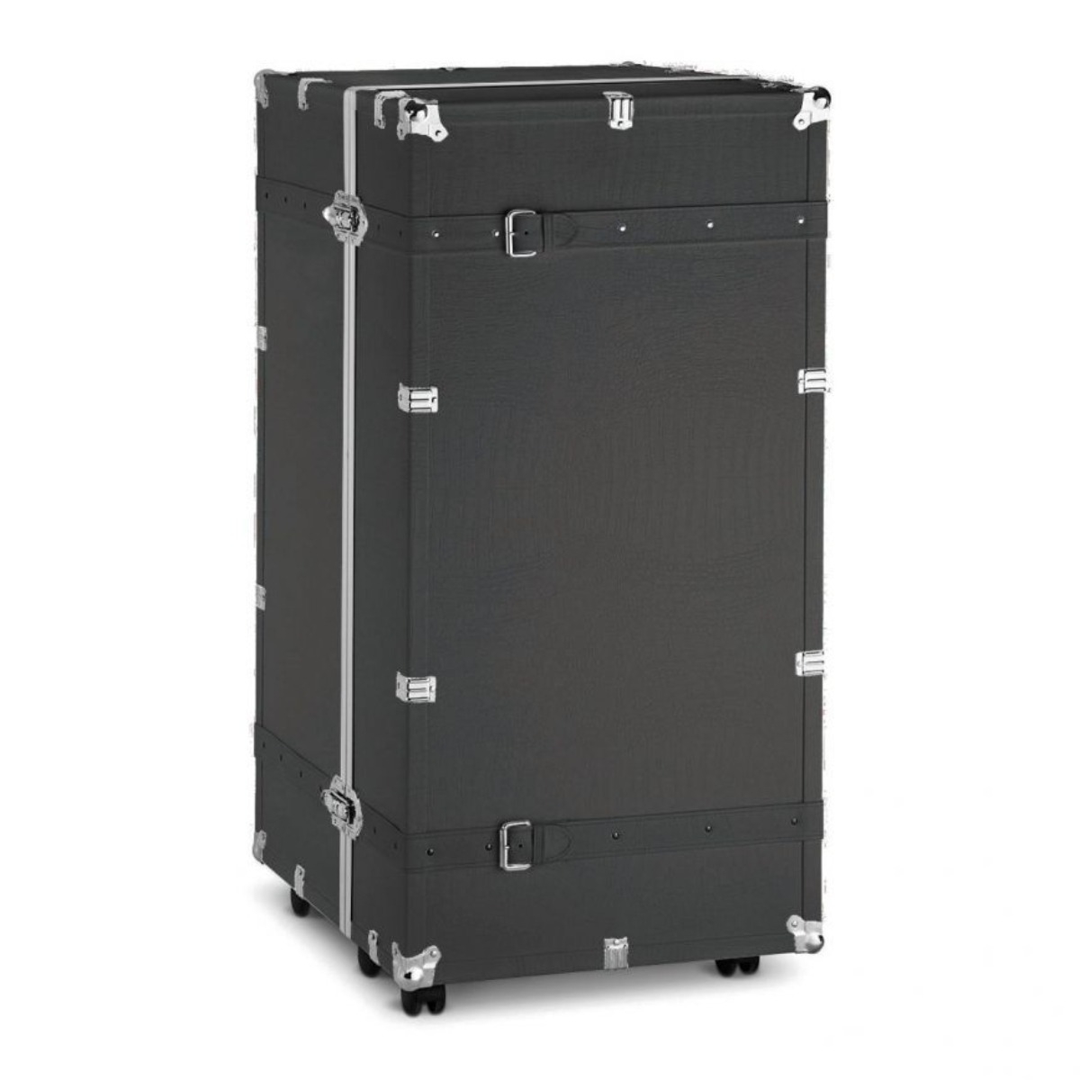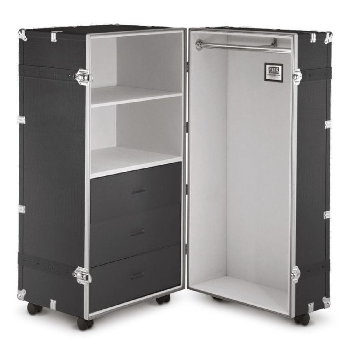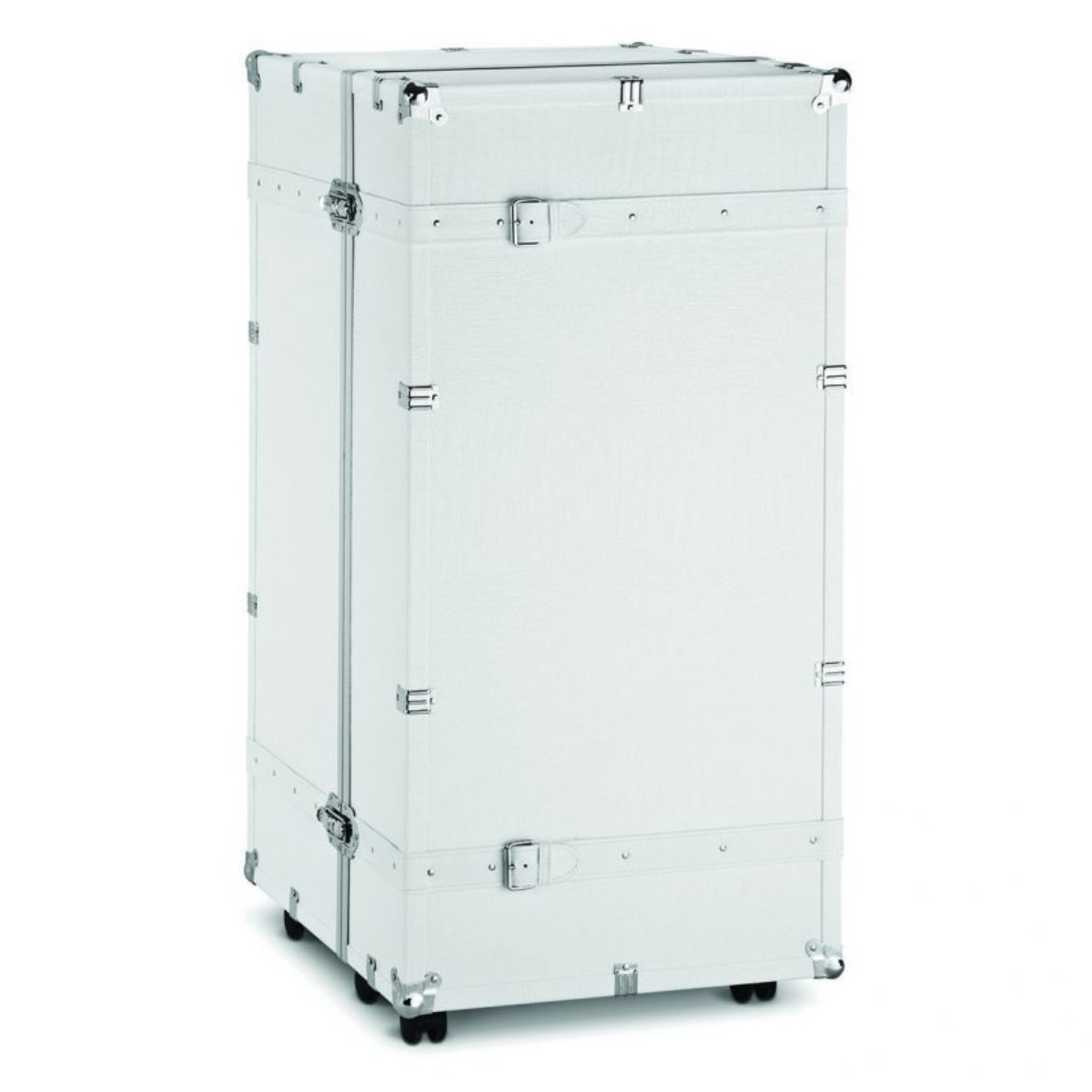 Klassisch und modern, schwarz und weiß. Eine Linie mit einem Hauch von Vintage, die an die Antike erinnert, mit einem Blick für Innovation, um Ihr Zuhause mit Eleganz und Kreativität einzurichten. Alles exklusiv in Italien hergestellt. Der Schrankkoffer hat drei Schubladen und Einlegeböden auf einer Seite und Kleiderbügel auf der anderen. Zusammenklappbar mit einem doppelten Schloss. Dekorative Elemente wie Gürtel verlaufen entlang des gesamten Schrankkörpers und machen dieses Produkt einzigartig und elegant. Leicht zu bewegen dank der 8 Räder, die am Boden montiert sind.