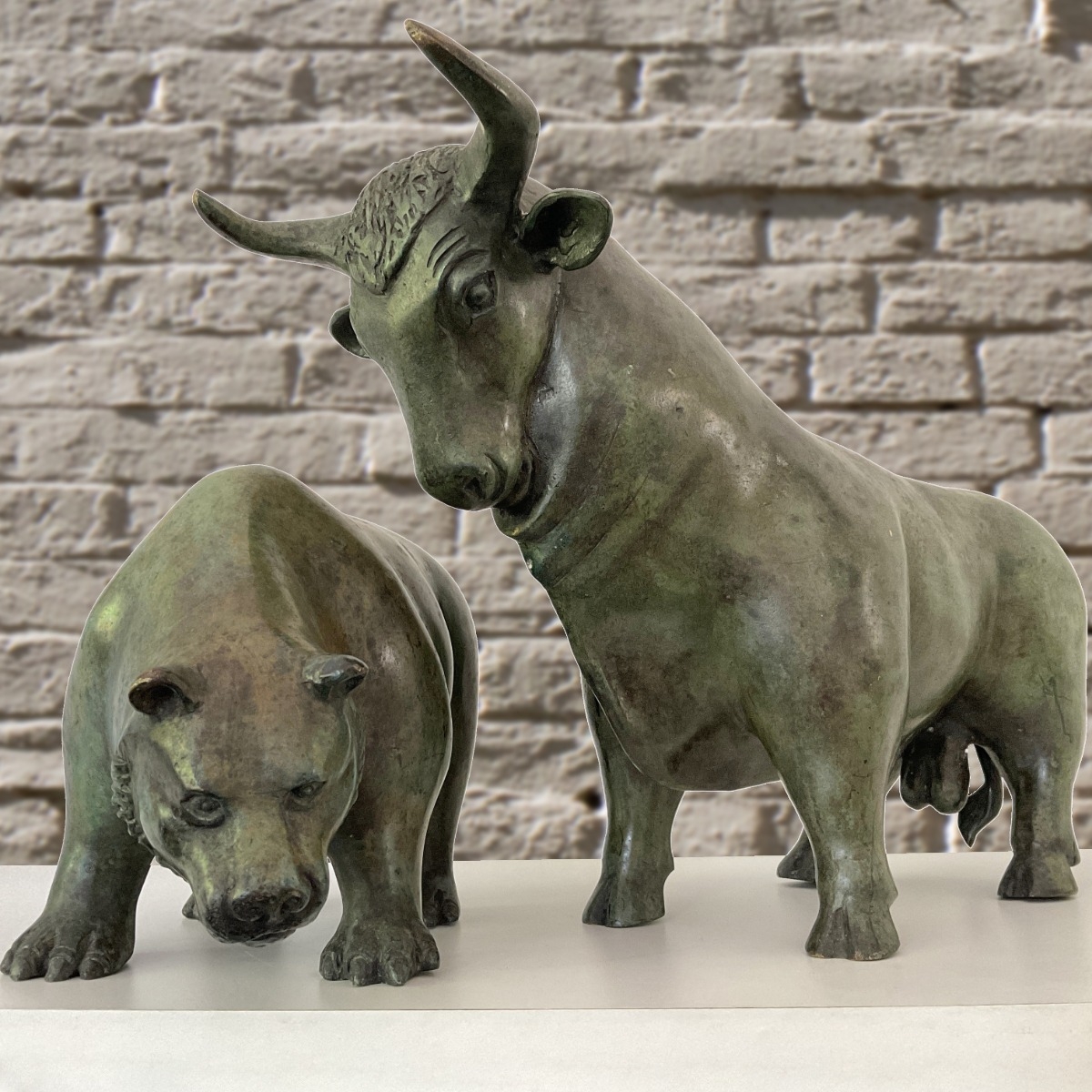 Die hochwertige, außerordentlich kunstvoll gearbeitete Bronzeskulptur eines Stier und eines Bären besticht durch ihr symbolträchtiges, modernes Design. Mit dieser Skulptur wird das ständige Auf und Ab der Aktienkurse an der Börse dargestellt. Der Begriff Bullenmarkt steht an der Börse für anhaltend steigende Kurse, Bärenmarkt hingegen für anhaltend sinkende Kurse. Die Börse unterscheidet zwischen Bären- und Bullenmarkt. Der Bär setzt auf einen erwarteten Kursabfall – er ist pessimistisch. Er macht sein Geld durch Skepsis und Unglauben, spekuliert auf sinkende Kurse oder kauft Verkaufsoptionen. Ein Bärenmarkt geht bergab. Der Bulle ist das Gegenteil – er ist optimistisch. Er kauft in der Hoffnung auf Aufschwung. Ein langfristiger Bullenmarkt ist etwas, worauf die Investoren hoffen.