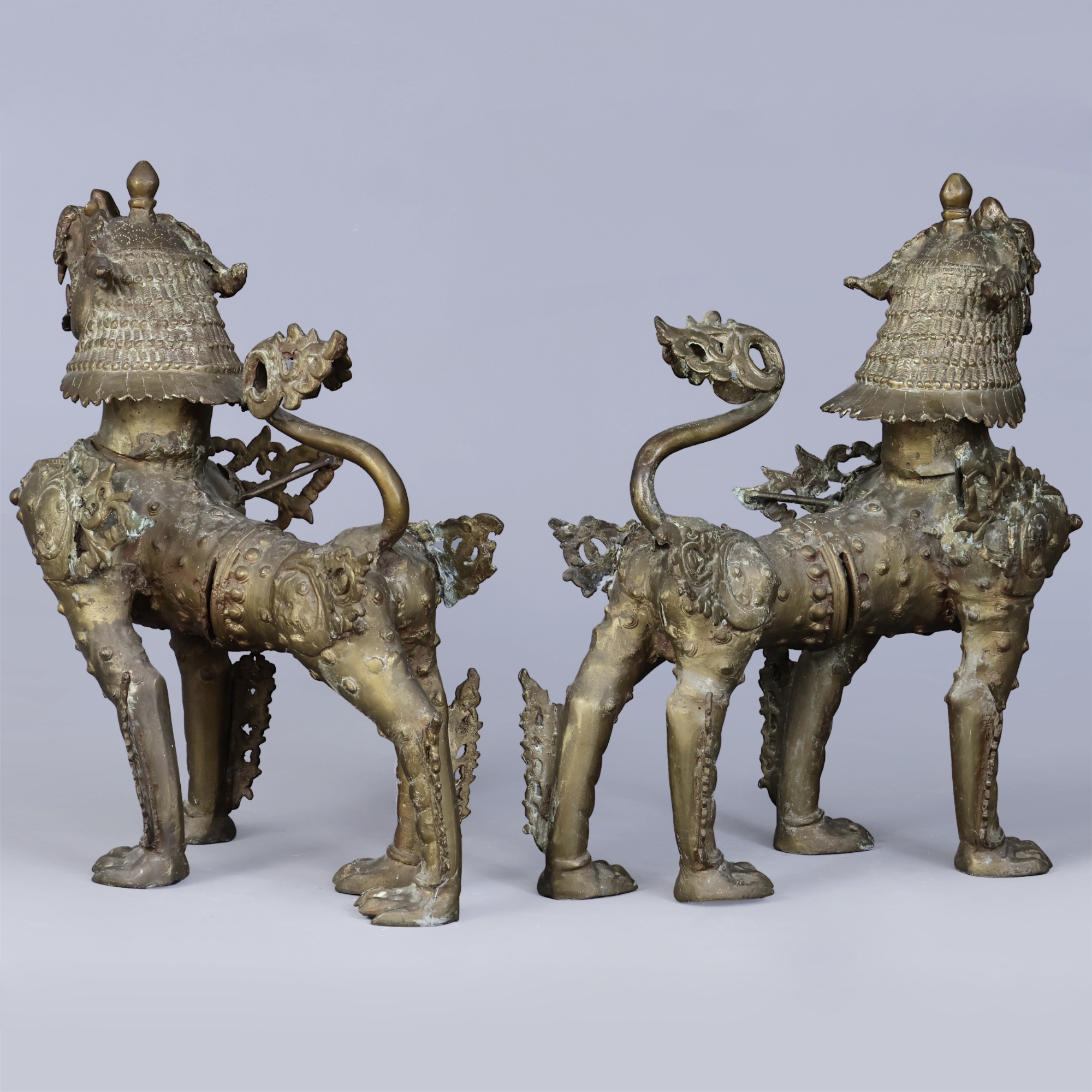 Bei diesen Skulpturen handelt es sich um einen schweren Bronzeguss gefertigt in der zweiten Hälfte des 20. Jahrhunderts. Bemerkenswert sind vor allem die filigranen Strukturen, die die Rüstung der Löwen ausmacht. Ein Zeugnis traditioneller Handwerkskunst. Bereichern Sie Ihr Zuhause um dieses antik-grün patinierte Fu-Hunde-Paar, von denen einer nach links und der andere nach rechts schaut, und erleben Sie ihre einzigartige Ausstrahlung.