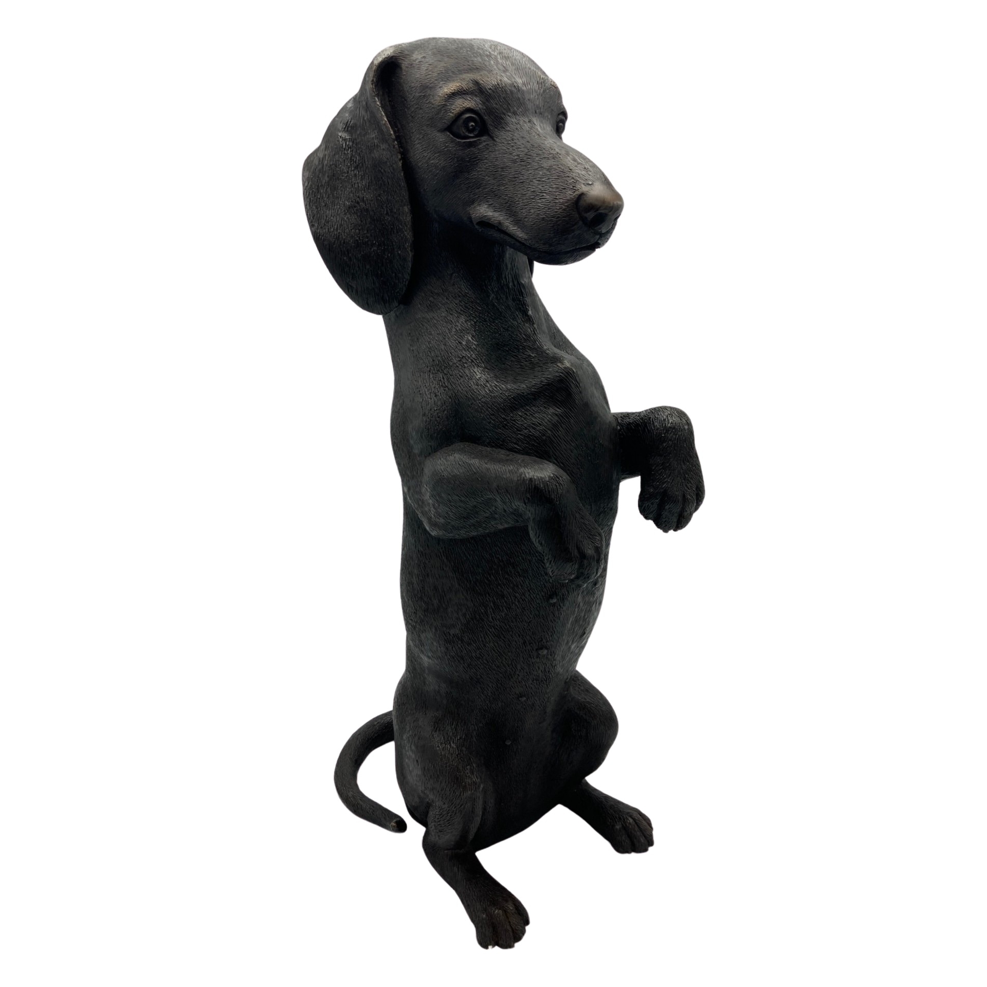 Süßer "Bewacher" für Ihren Garten. Die Hundeskulptur unseres Teckel ziert gerne in Zukunft Ihren Garten. Der Bronzehund ist sehr filigran ausgearbeitet und begeistert dazu mit einer aufwendigen braun-schwarzen Patina. Besonders der detaillierte Kopf und das feine Fell tragen zu der perfekten Darstellung bei. Die naturalistische Haltung und der neugierige Blick des Tieres runden den Gesamteindruck ab. Mit unserer Bronzeskulptur "Dackel macht Männchen" erwerben Sie ein einzigartiges Sammlerstück und einen besonderen Hingucker.