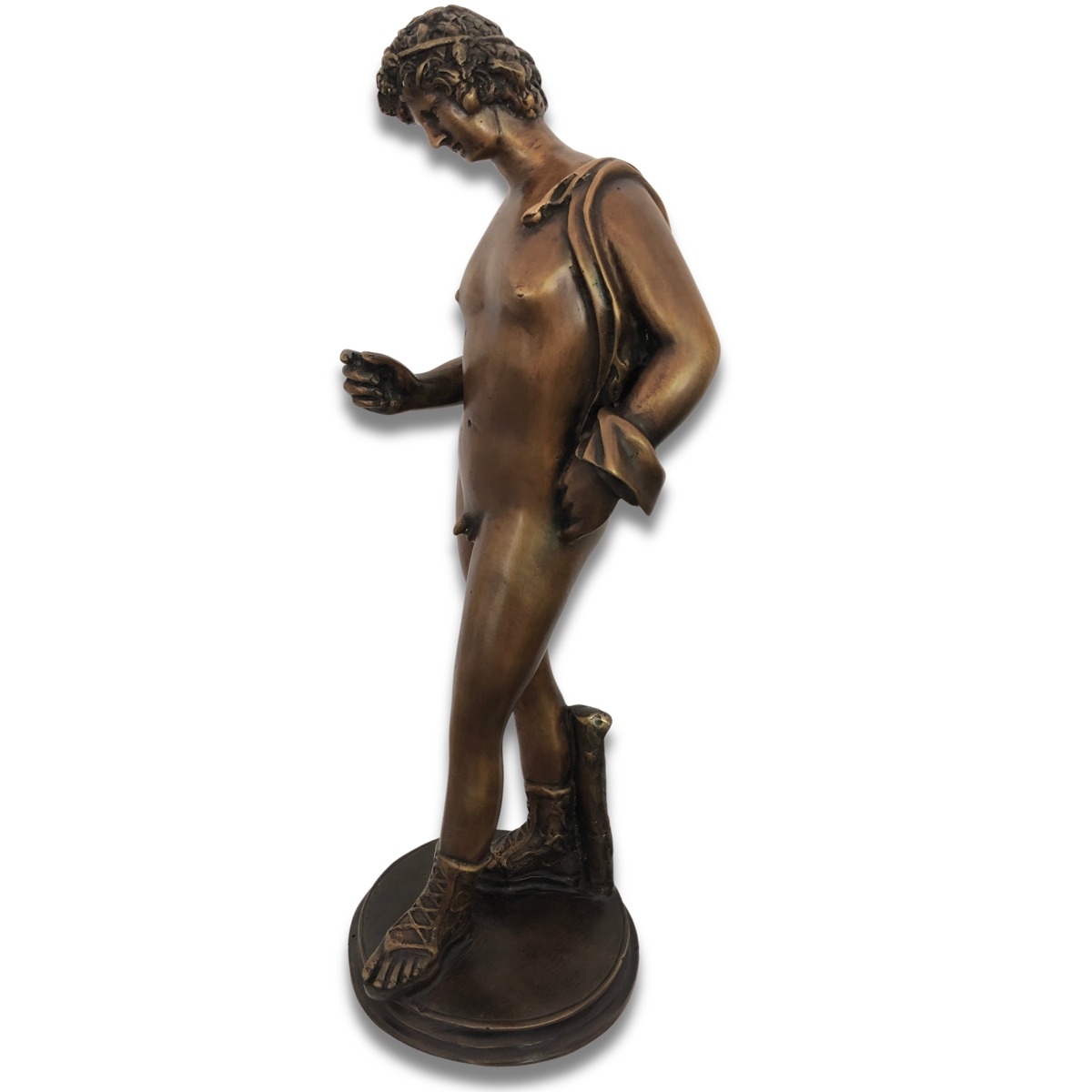 Dionysos ist der griechische Gott des Weines, der Freude, der Fruchtbarkeit und der Ekstase. Er ist der jüngste der großen griechischen Götter, was sich ebenfalls in dieser Bronzeskulptur widerspiegelt. In dieser hochwertigen Skulptur wurde Dionysos (im römischen Dionysus) in seiner Jugend und fast gänzlich unbekleidet dargestellt.