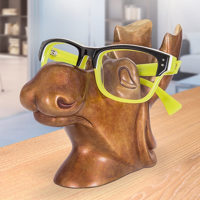 Der Elchbulle ist so geformt, dass eine Brille auf ihm Platz findet. Auf diese Weise ist er einerseits amüsantes und handwerklich perfekt umgesetztes Kunstwerk, das zur Betrachtung einlädt, andererseits aber blickt er brillenbewehrt zurück und macht sich besonders nützlich, weil er gerade nicht getragenen Brillen einen festen, leicht zu merkenden und immer wieder auffindebaren Platz geben.