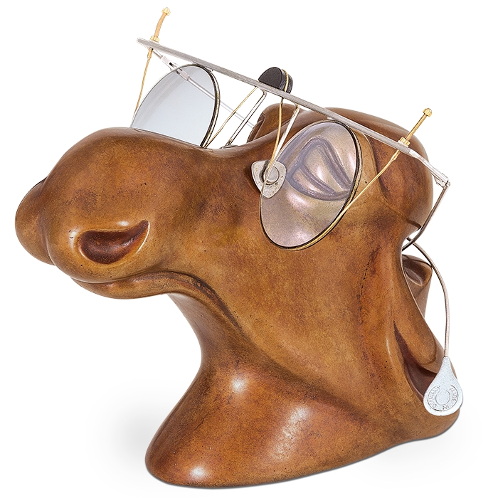 Die Elchkuh ist so geformt, dass eine Brille auf ihr Platz findet. Auf diese Weise ist sie einerseits amüsantes und handwerklich perfekt umgesetztes Kunstwerk, das zur Betrachtung einlädt, andererseits aber blickt sie brillenbewehrt zurück und macht sich besonders nützlich, weil sie gerade nicht getragenen Brillen einen festen, leicht zu merkenden und immer wieder auffindebaren Platz gibt.