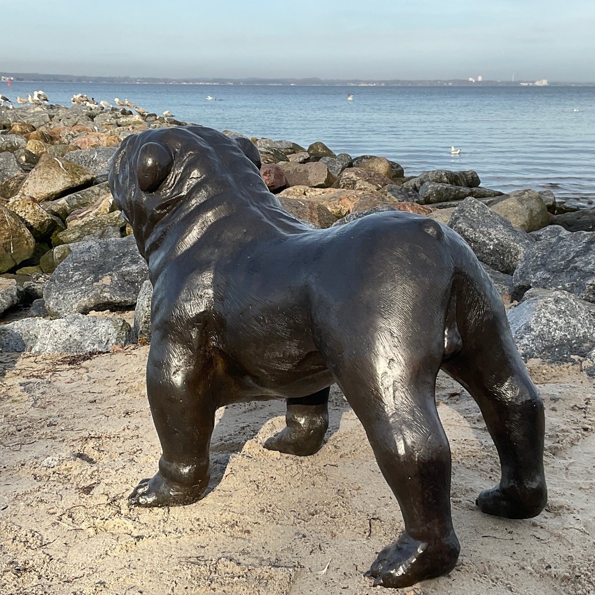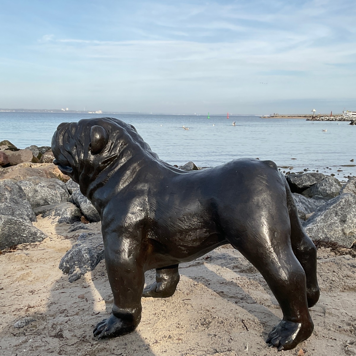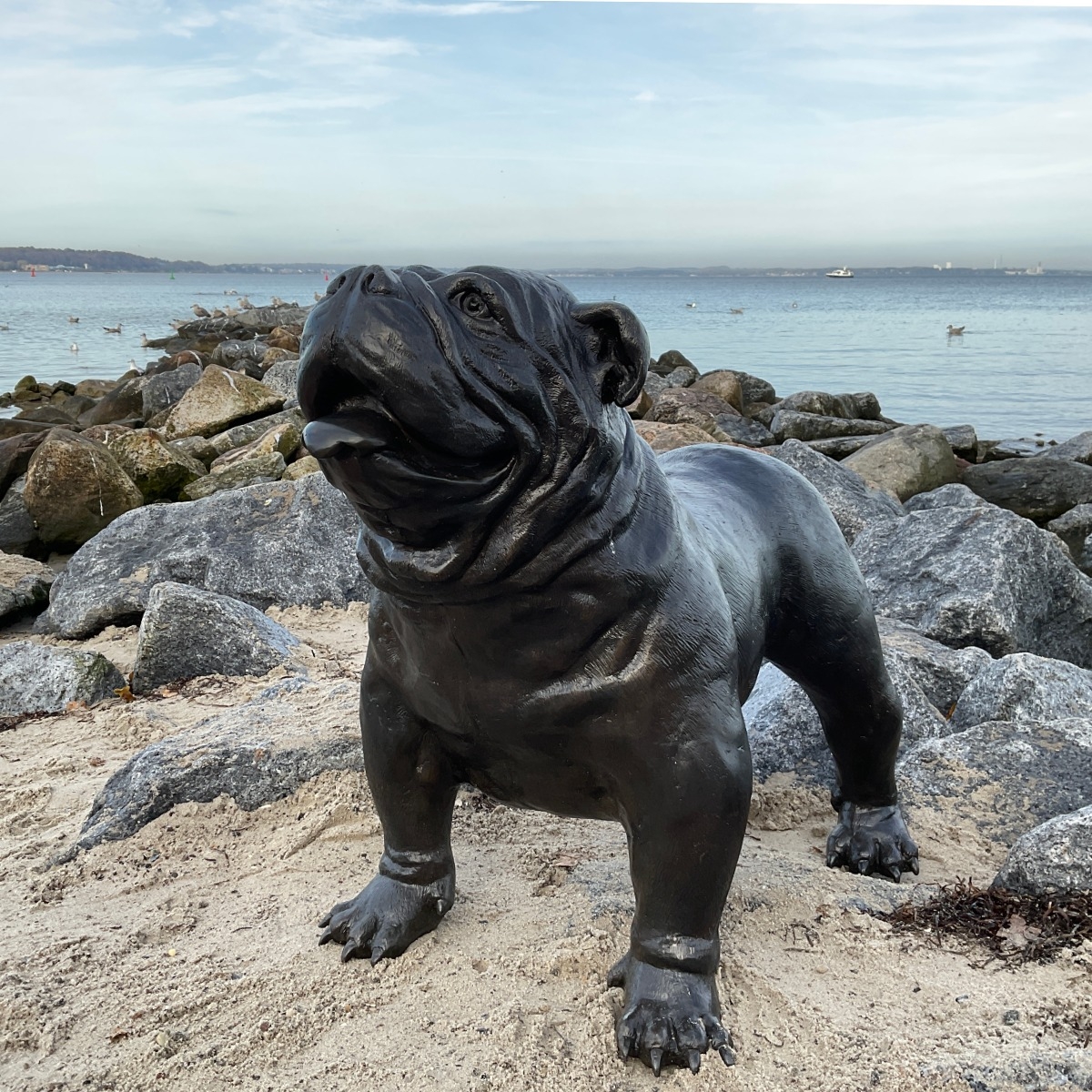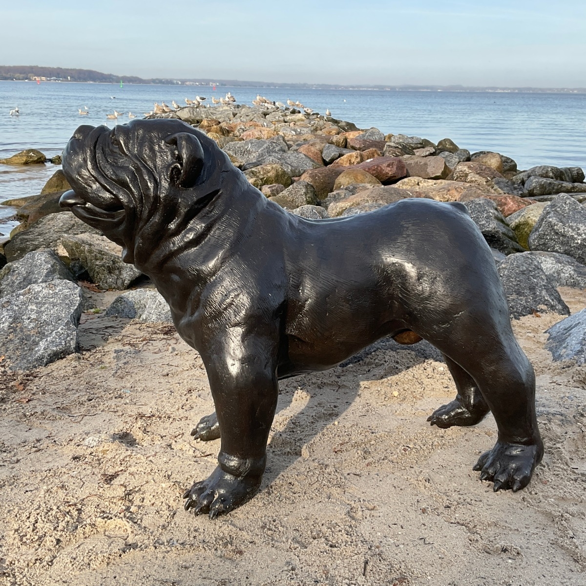 Konträr zu ihrem grundsätzlich grimmigen Aussehen, gehört die Englische Bulldogge zu den besonders sanften und schmusebedürftigen Hunderassen. Das ist dieser Skulptur auch auf den ersten Blick anzusehen. Freundlich scheint sie den Betrachter geradezu anzulächeln.
