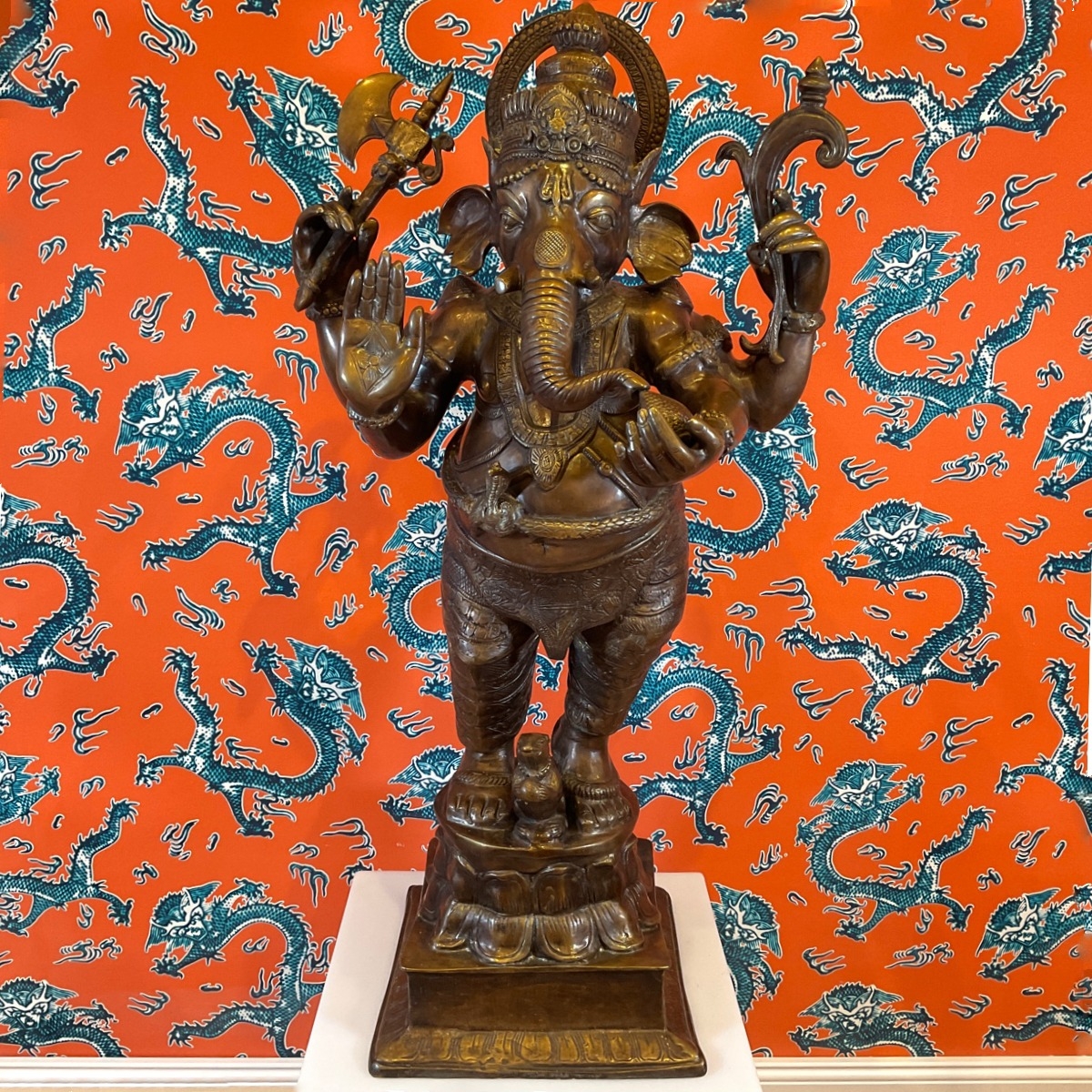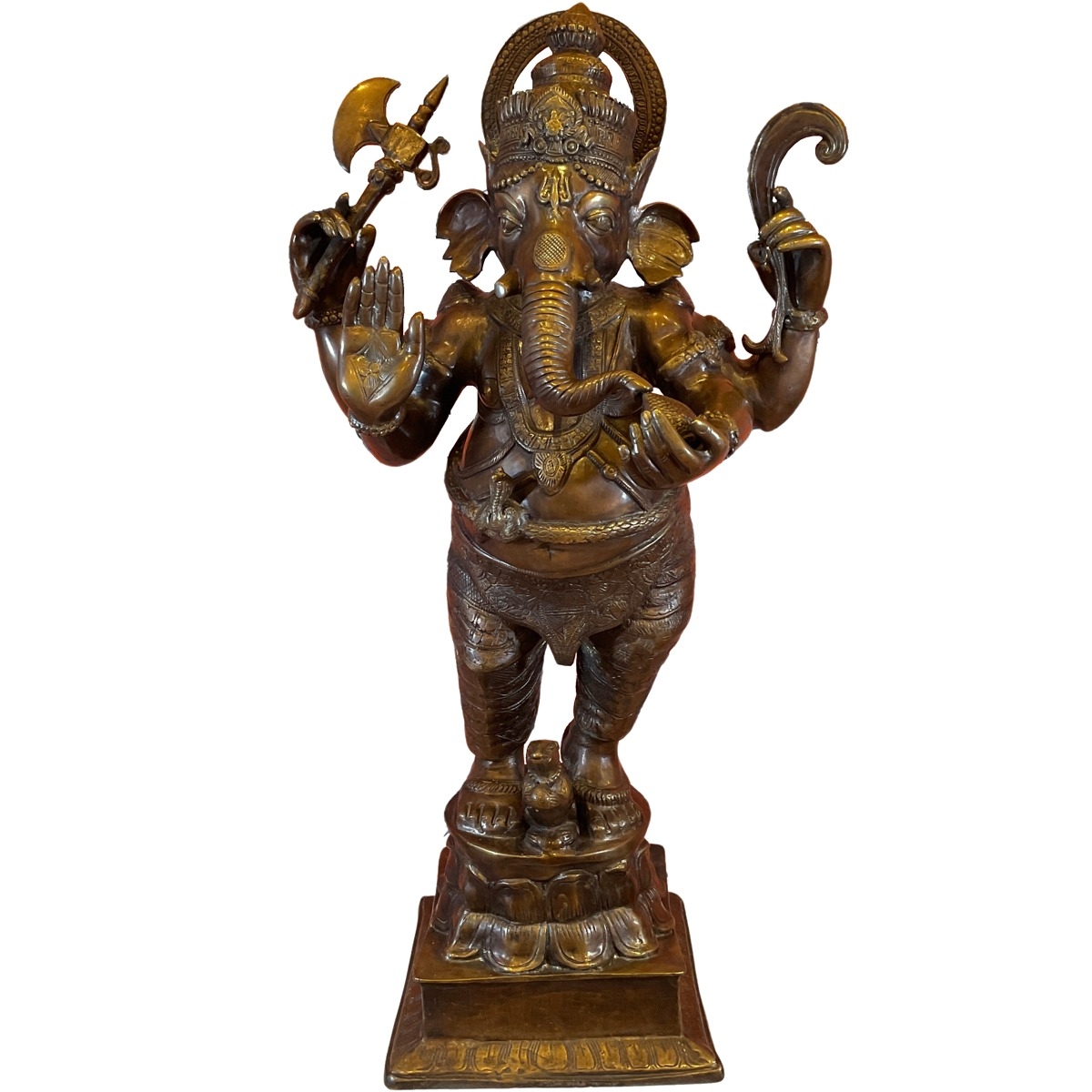 Diese knapp einen Meter hohe Bronzefigur zeigt Ganesha nicht allein, sondern dazu mit seinem Reittier, einer Maus zu seinen Füßen. Er besitzt vier Arme und hält in einem eine Waffe für den Kampf gegen alles Übel sowie auch eine Modaka, eine indische Süßigkeit. Diese steht für die Belohnung spiritueller Sinnsuche.