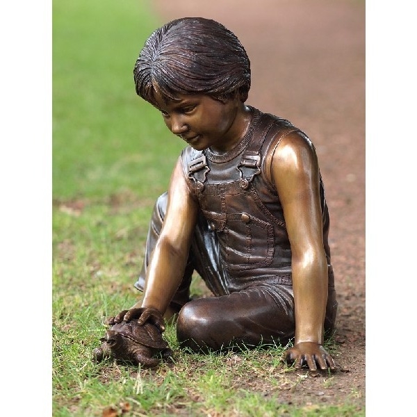 Diese Skulptur zeigt ein kleines Mädchen, das sitzt und zärtlich ihre Schildkröte streichelt. Erwiesenermaßen können Schildkröten Berührungen am Panzer spüren und genießen eine Streicheleinheit nicht weniger als ein Hund oder eine Katze. Die Patina dieser entzückenden Skulptur weist verschiede Farbnuancen auf, die Haut des Mädchens strahlt in einem helleren, warmen Ton und stellt einen Kontrast dar zu der dunkleren Färbung ihrer Kleidung, des Haars und der Schildkröte.