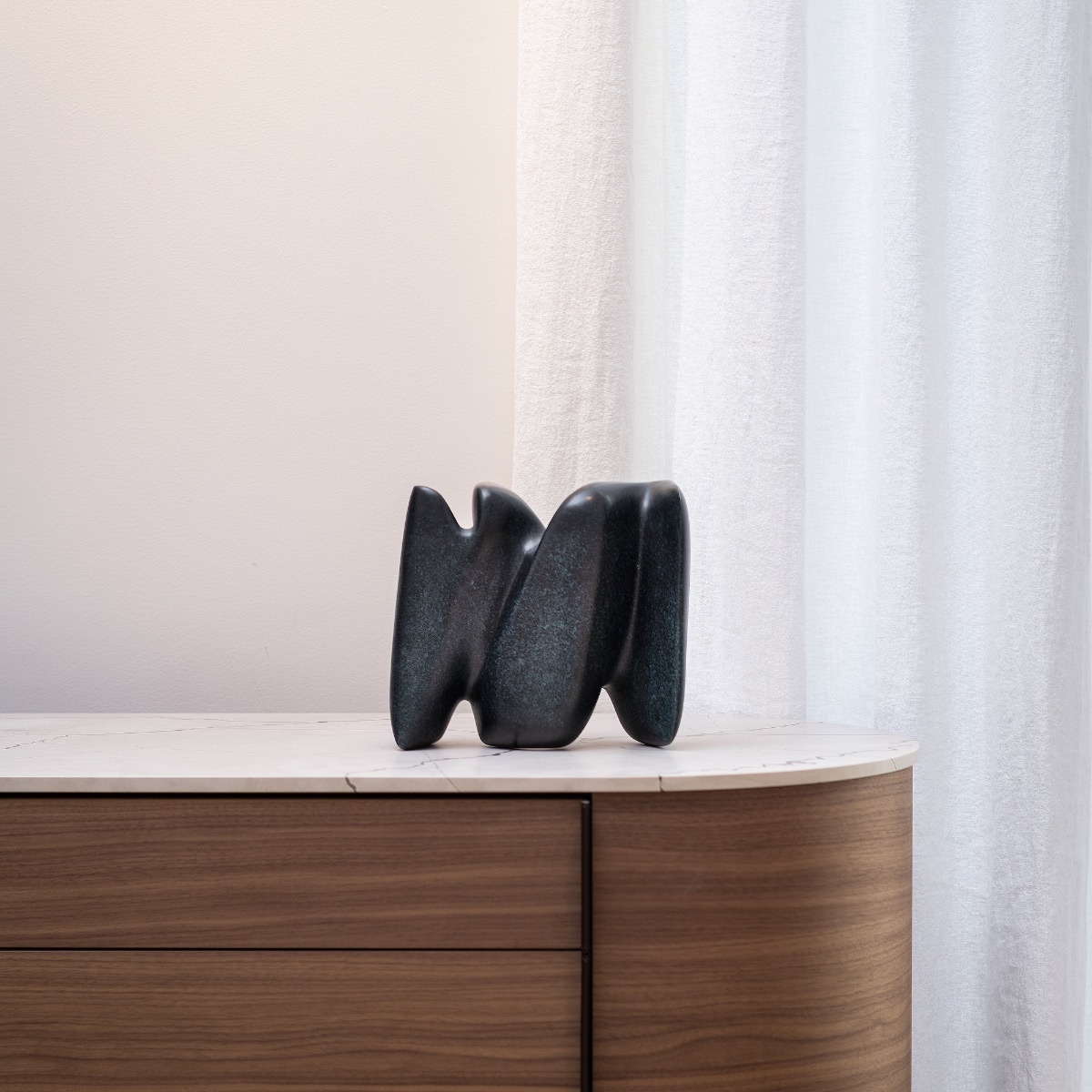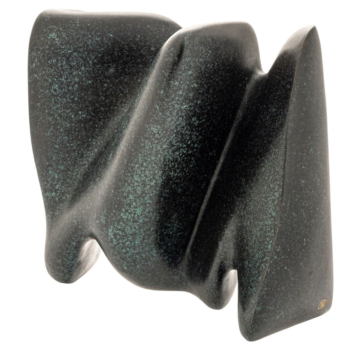 Die abgerundete biomorphe Form erinnert an die spektakuläre isländische Landschaft und macht Jörd zu einem charmanten und ästhetisch ansprechenden Statement. Die Skulptur ist in einer tief grünlich-blauen Patina erhältlich.