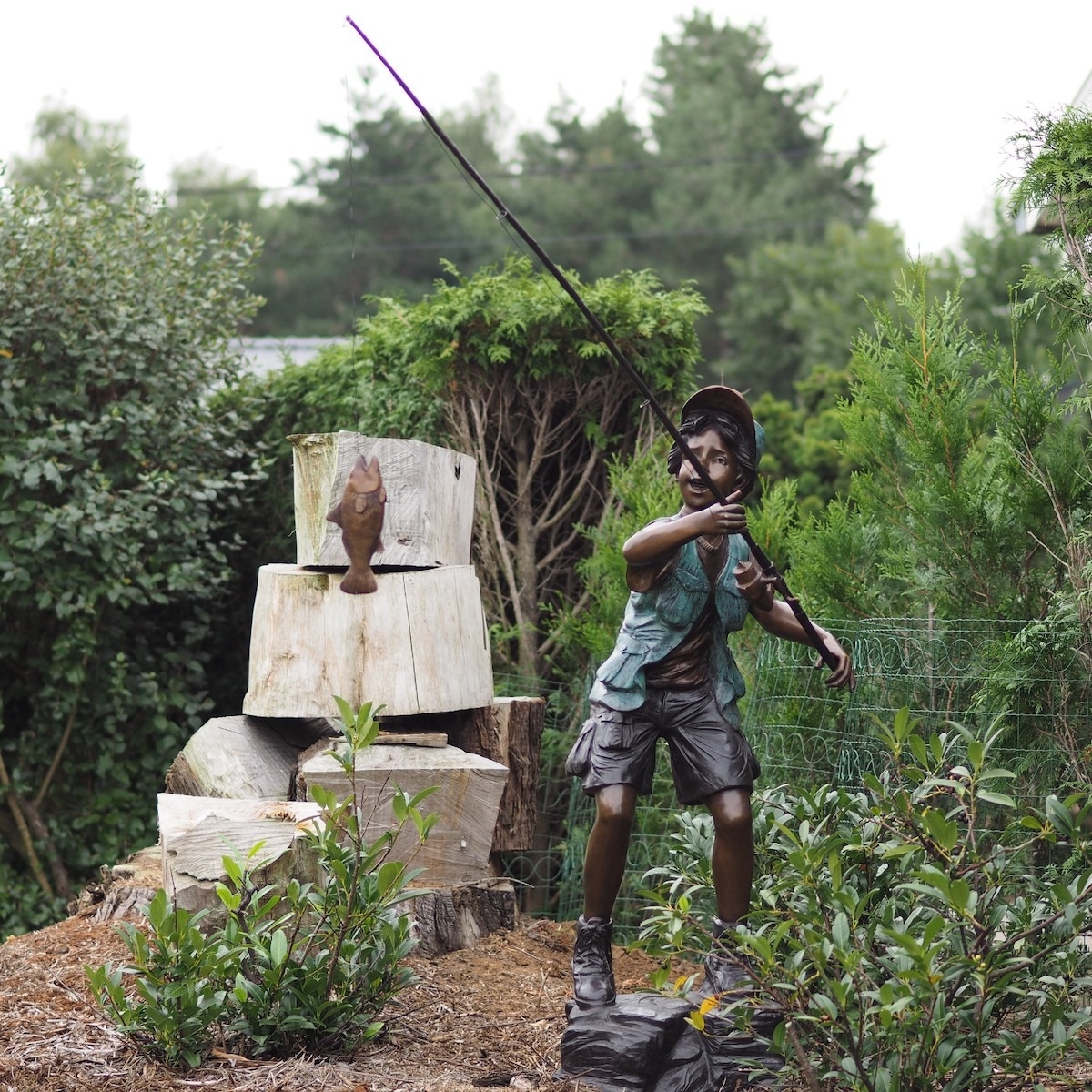 Aufwendig ausgeformter Junge mit zahlreichen Details und einer fröhlichen Mimik. Dank der mehrfarbigen Patina kommen die einzelnen Elemente, wie die Angel, der Stein-Sockel oder gar die Schnürsenkel der Figur sehr schön hervor. Der klassische Angler, freudig entspannt bei seinem Hobby.