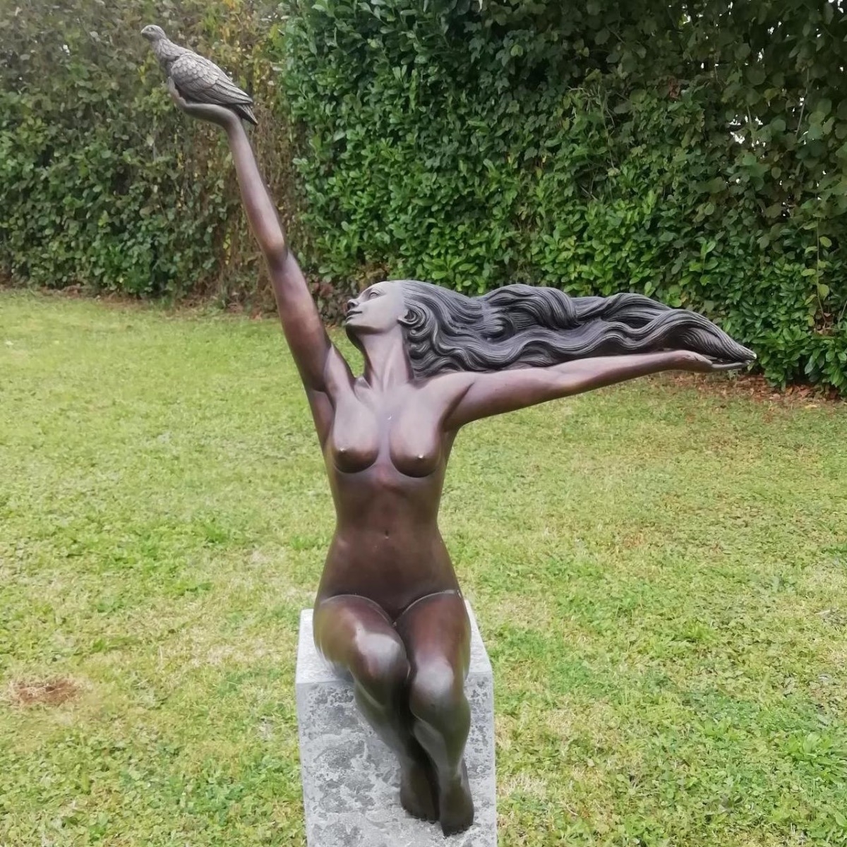 Bronzeskulptur "Junge Emilia mit Vogel" Aktfigur