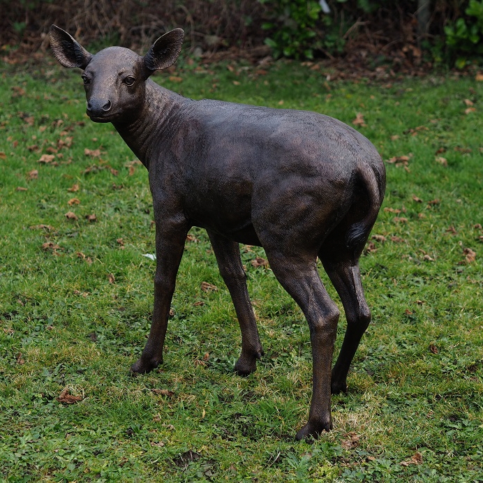 Diese Bronzefigur einer Hirschkuh ist detailliert gefertigt mit Fokus auf natürliche Details. Die braune Patina verleiht der Skulptur den authentischen Charme des Bronzemetalls.