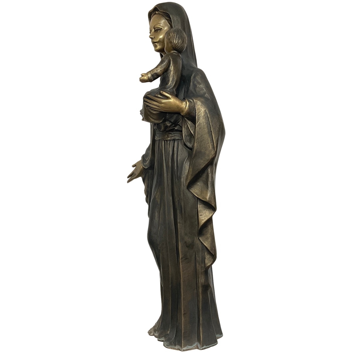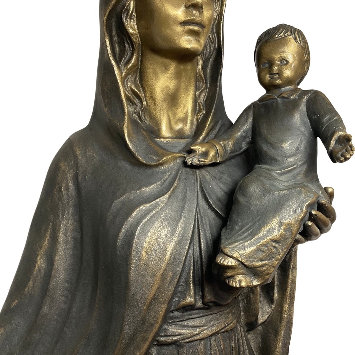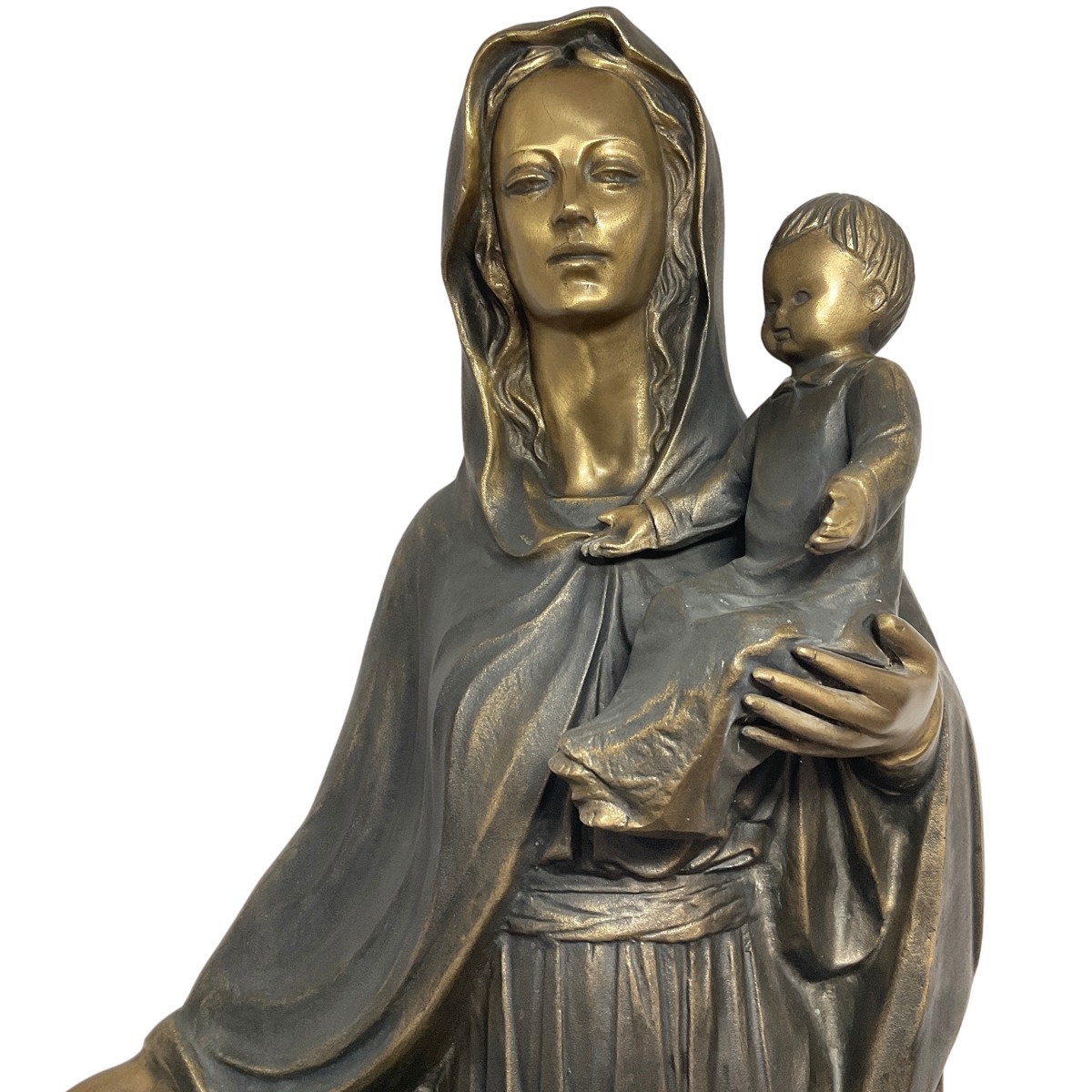 Dieser schwere Bronzeguss ist ein sehr hochwertig gefertigtes Einzelstück und überzeugt durch die besonders feine Ausarbeitung mit vielen Details. Das Gewand und das Gesicht der Figur sind eine herausragende Fertigung, auch über die Hände und das filigran geformte Kind bringen den Betrachter zum Staunen.
