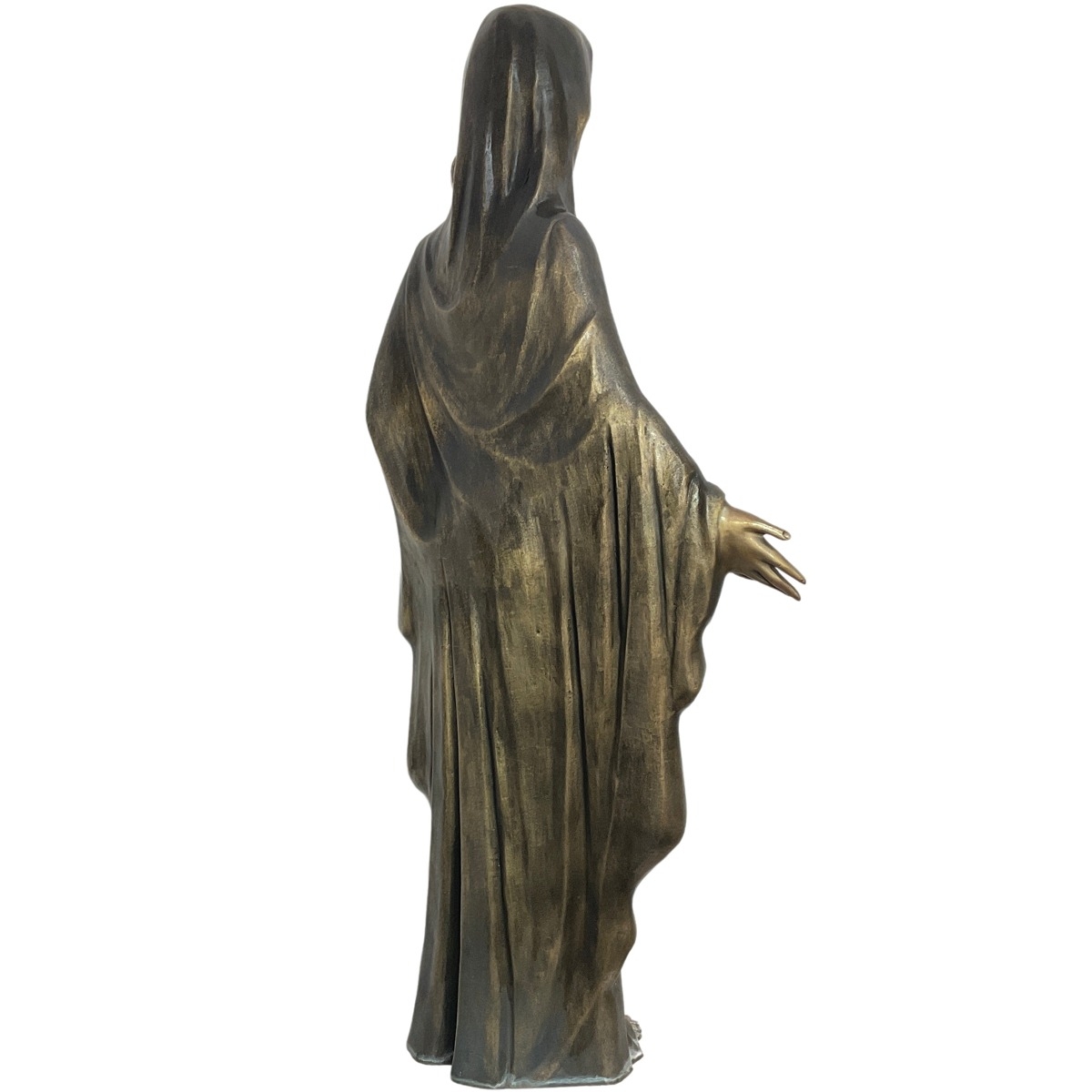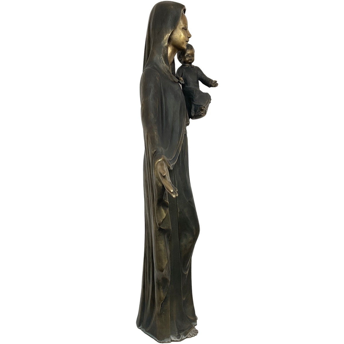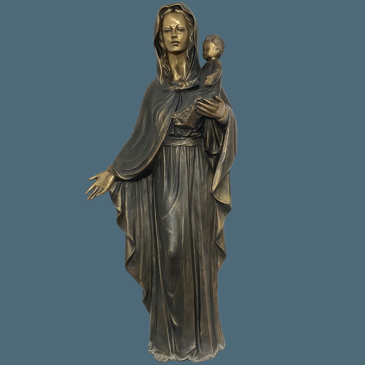 Dieser schwere Bronzeguss ist ein sehr hochwertig gefertigtes Einzelstück und überzeugt durch die besonders feine Ausarbeitung mit vielen Details. Das Gewand und das Gesicht der Figur sind eine herausragende Fertigung, auch über die Hände und das filigran geformte Kind bringen den Betrachter zum Staunen.