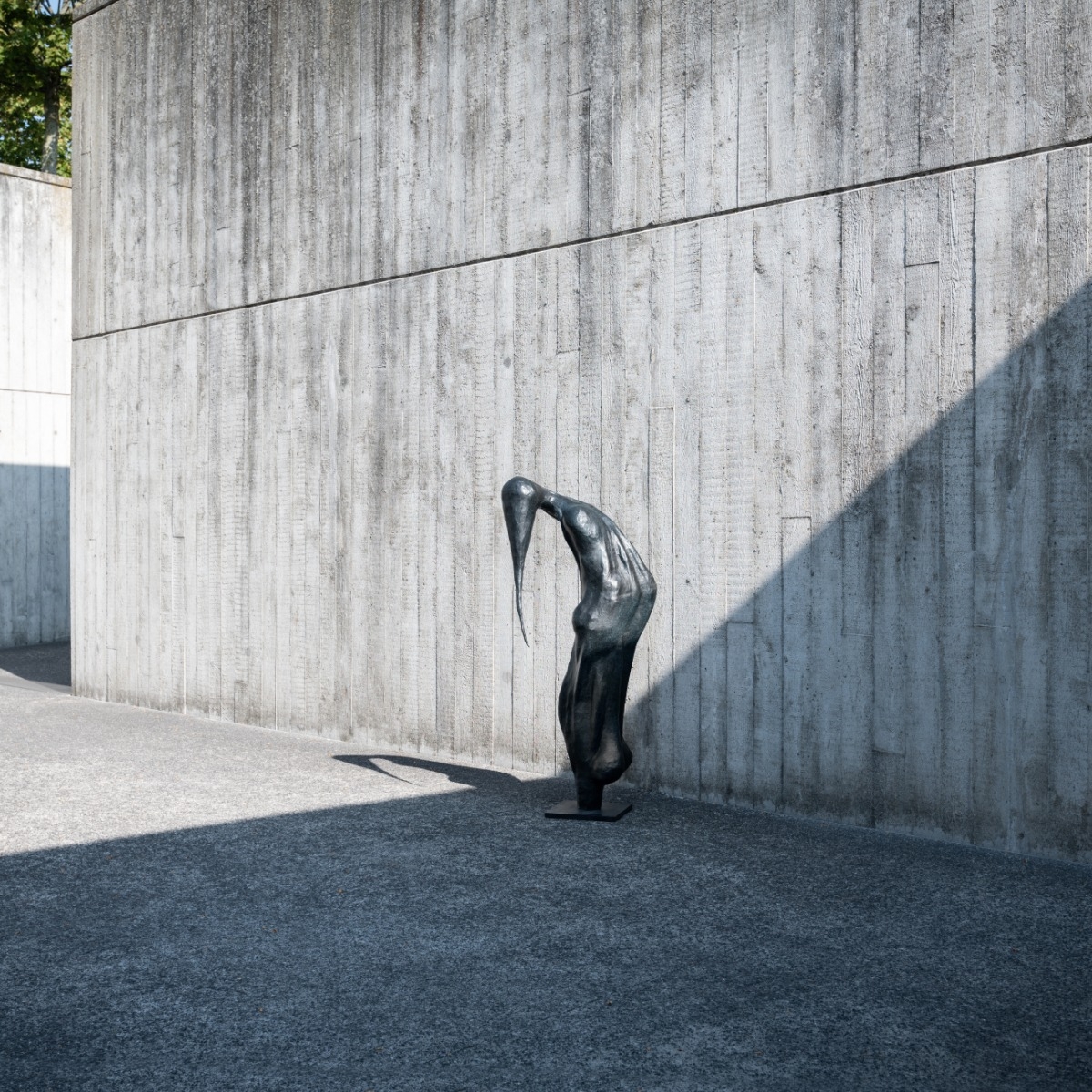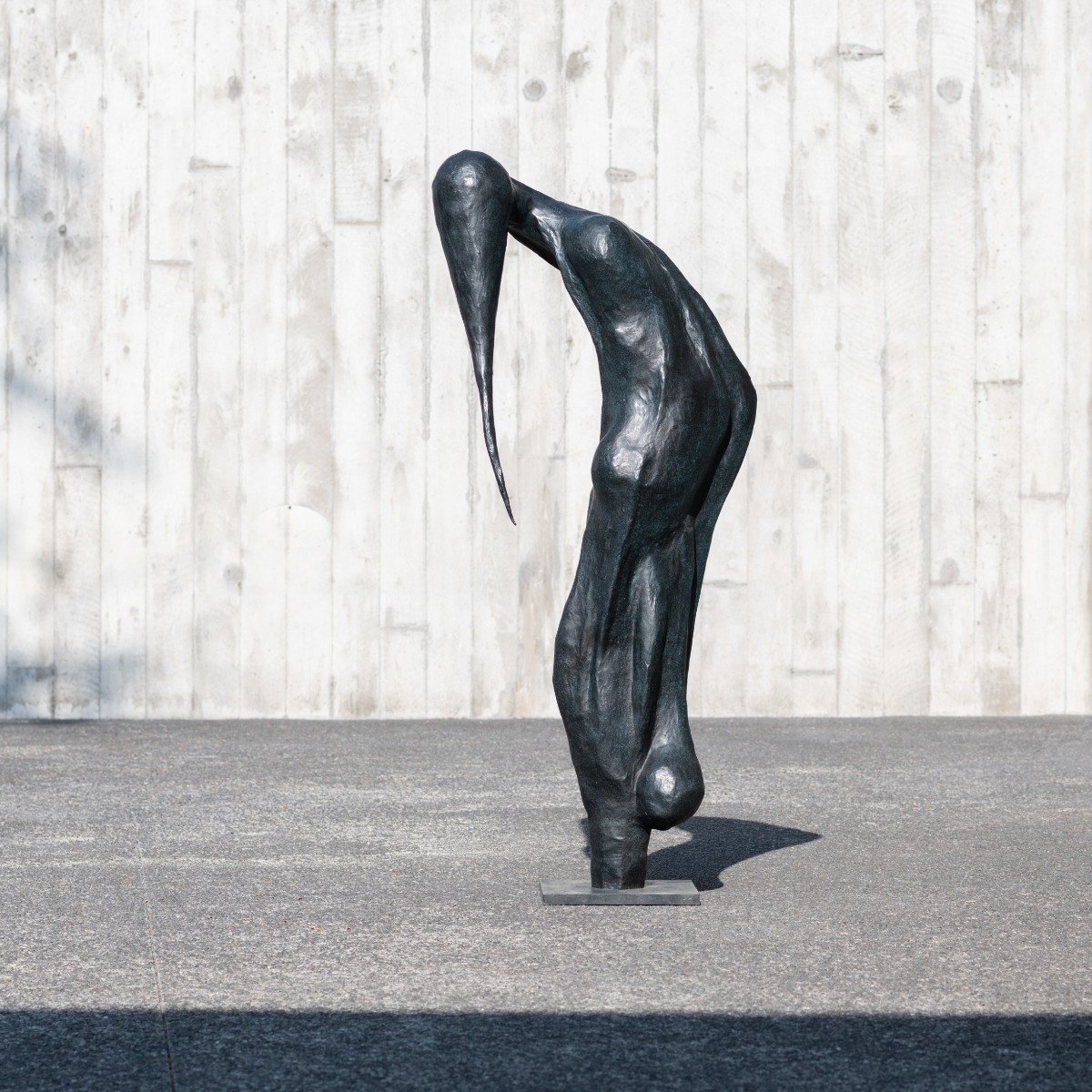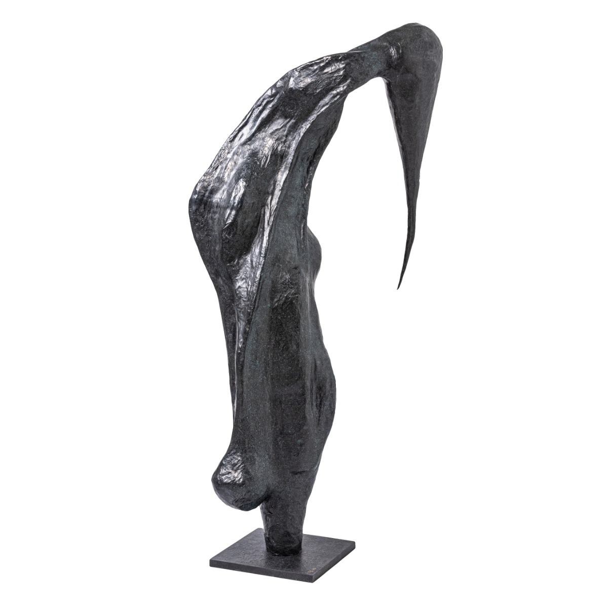 Die glatte Bronzeoberfläche, die fließenden organischen Linien und die graublaue Patina tragen zur geheimnisvollen und faszinierenden Erscheinung der Skulptur bei.
