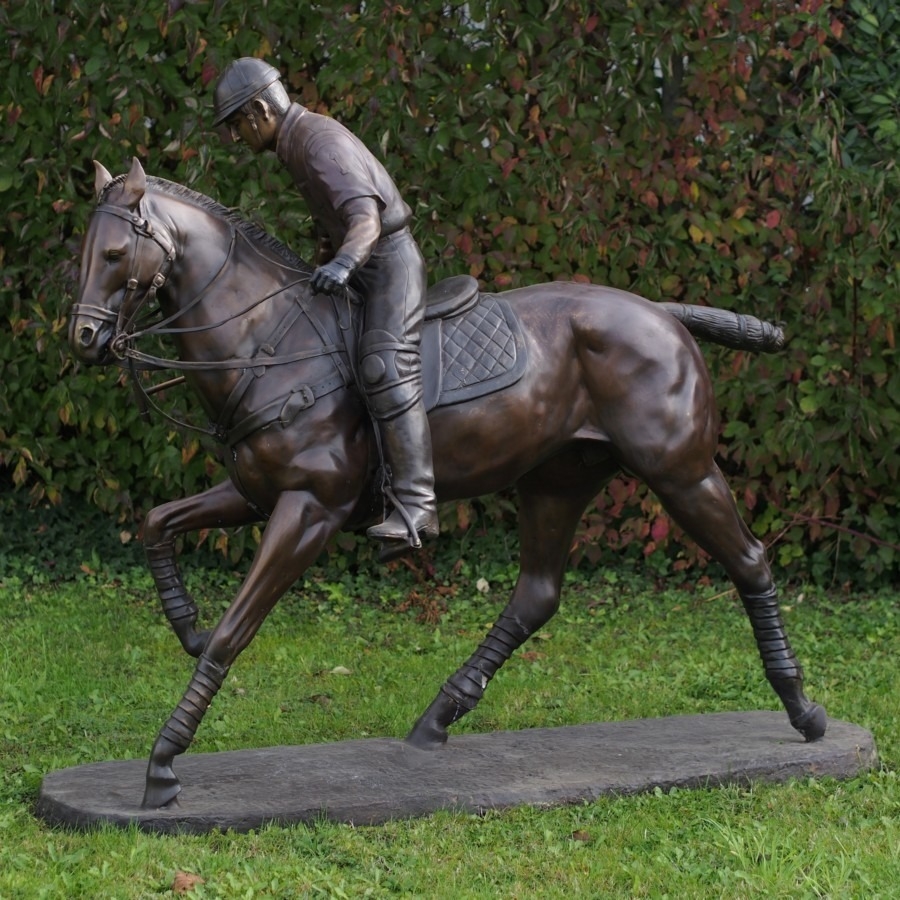 Besonders detaillierte Skulptur eines galoppierenden Pferdes mit seinem Polospieler. Diese besondere Künstlerbronze für Ihren Garten überzeugt mit unglaublichen Details. Beachten Sie besonders die feine Ausformung des Pferdes in all seinen Details, die vielen Feinheiten, besonders der Augen und dem Sattel. Auch der Polospieler ist wunderbar naturgetreu ausgeformt, dynamisch dargestellt, wirkt sehr realistisch.