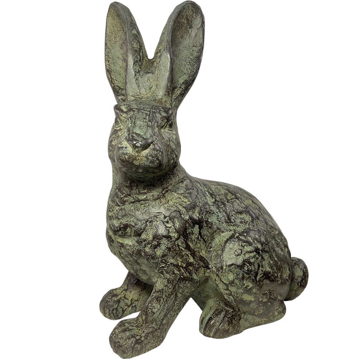 Diese Skulptur eines Feldhasen hat eine besonders schöne grün-graue Patina, welche das Gesicht sowie die Fellstruktur des Tieres heraushebt. Der aufmerksame Blick des Hasen macht ihn zu einem liebenswürdigen Dekorationsobjekt für jeden Garten.