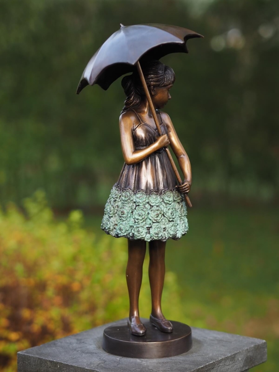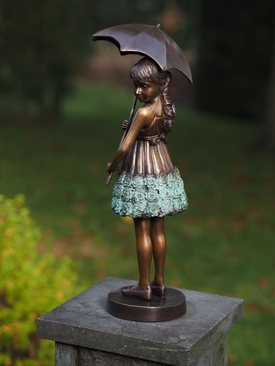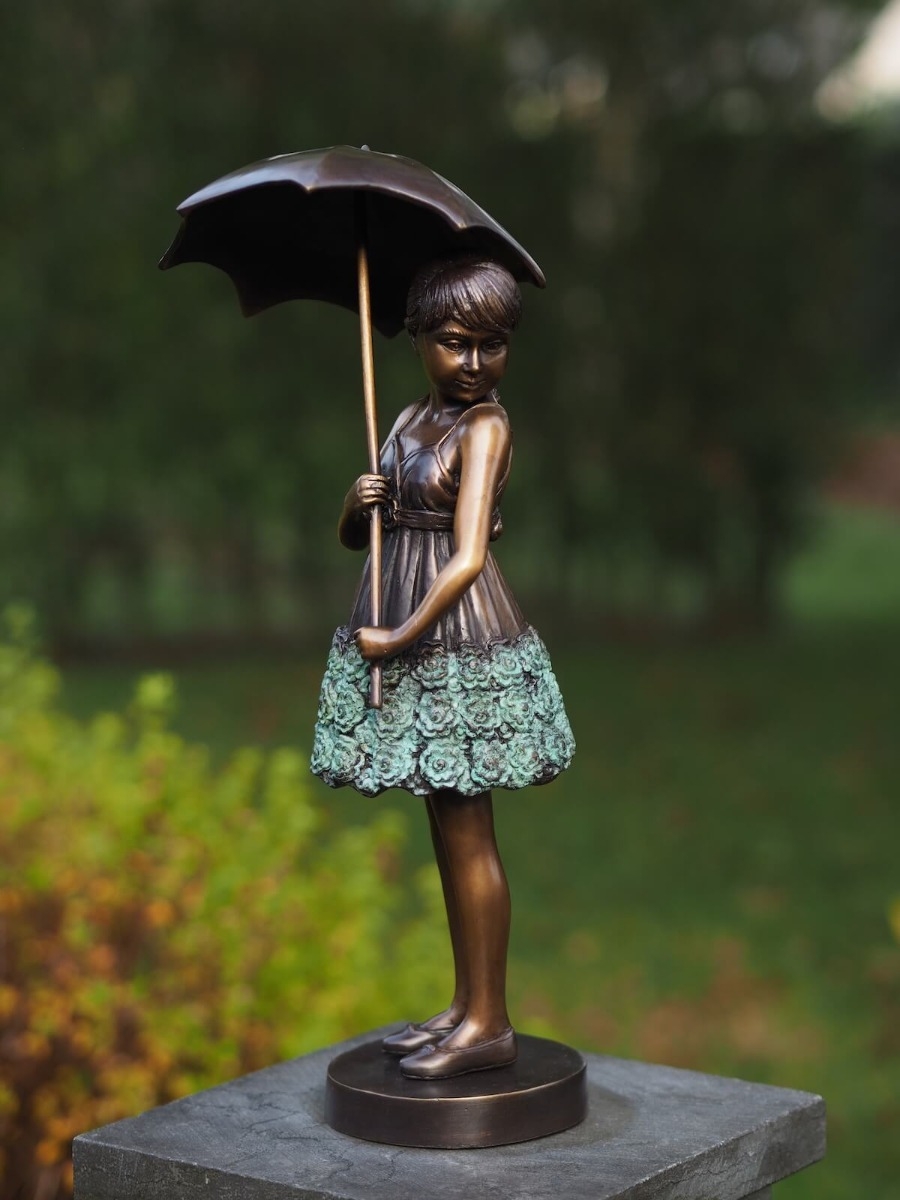 Unsere Bronzeskulptur "Sonja mit Regenschirm" ist ein tolles Dekorationselement für Ihren Garten und lässt sich an vielen Orten frei platzieren.