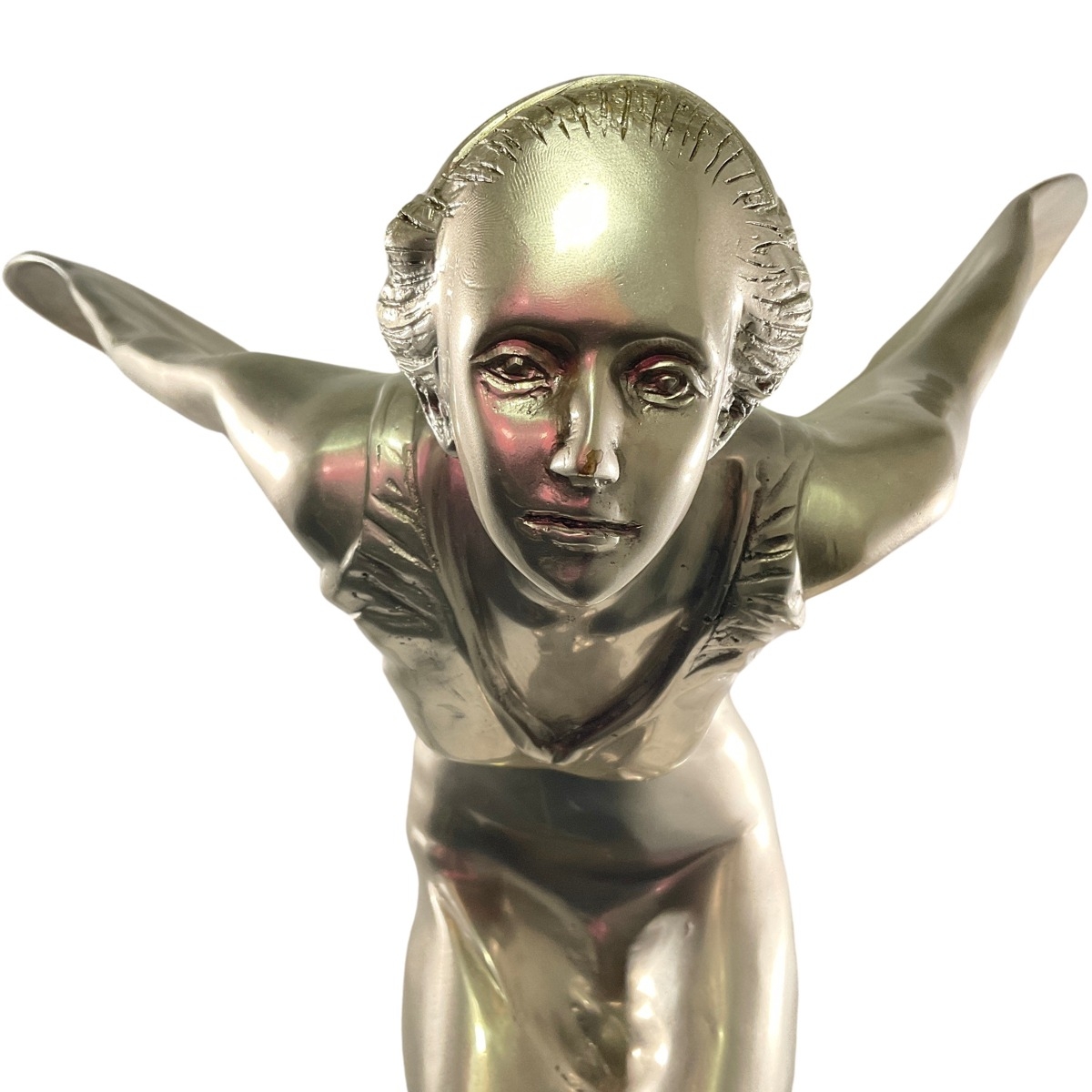 Diese Bronzeskulptur zeigt die ikonische Emily in voller Größe und in der markanten silbernen Patina. Das hochwertig gearbeitete Einzelstück ist auf einem schwarzen, geäderten Marmorsockel befestigt und ein Highlight für jeden Autoliebhaber und Sammler.