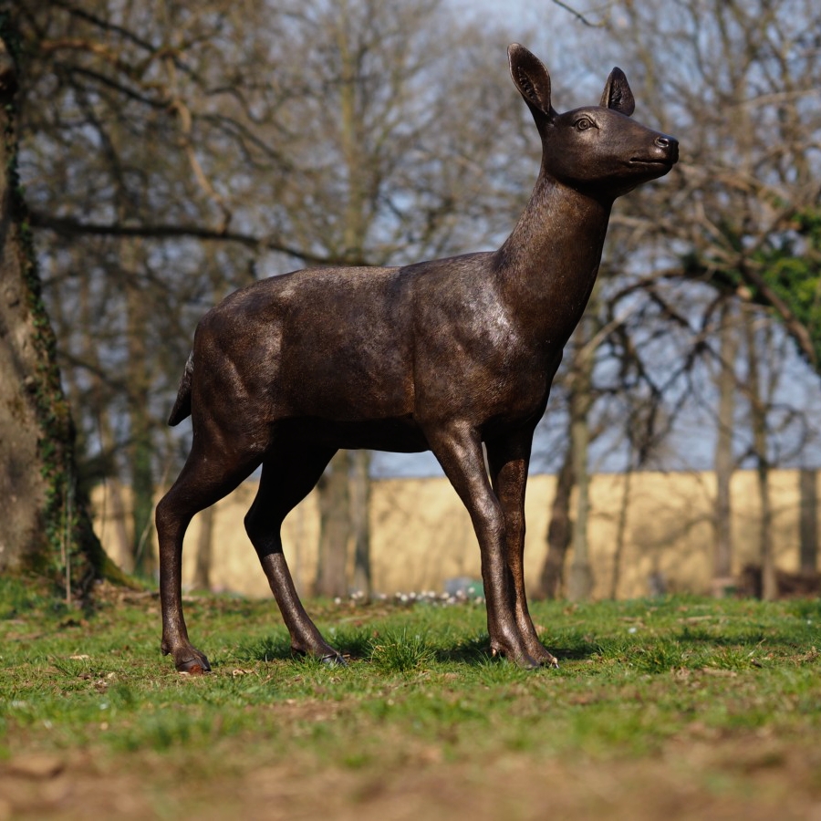 Stellen Sie diese prächtige Bronzeskulptur "Stehende Hirschkuh" in Ihren Garten und genießen Sie den Anblick dieses Kunstwerkes.
