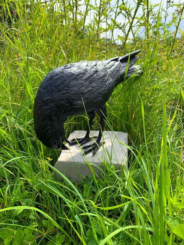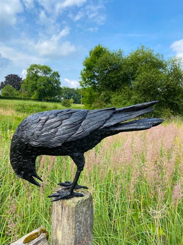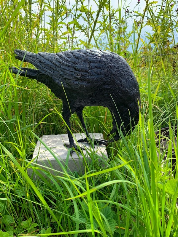 Nutzen Sie diese Bronzeskulptur "Suchender Rabe" als Taubenschreck in Ihrem Garten.