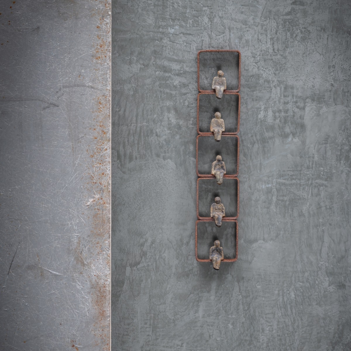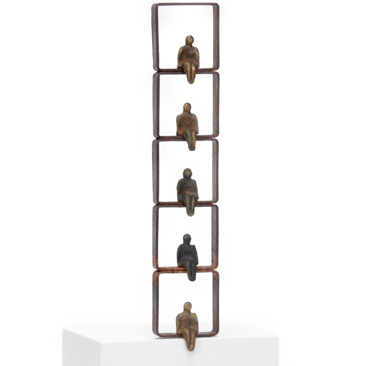 Die Skulptur mit insgesamt 5 Fenstern, in denen jeweils eine Figur die Beine baumeln lässt, ist aus hochwertiger Bronze geformt und kann einfach an eine Wand gelehnt werden.