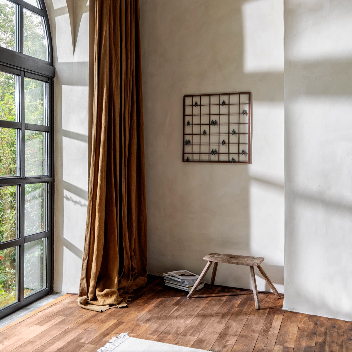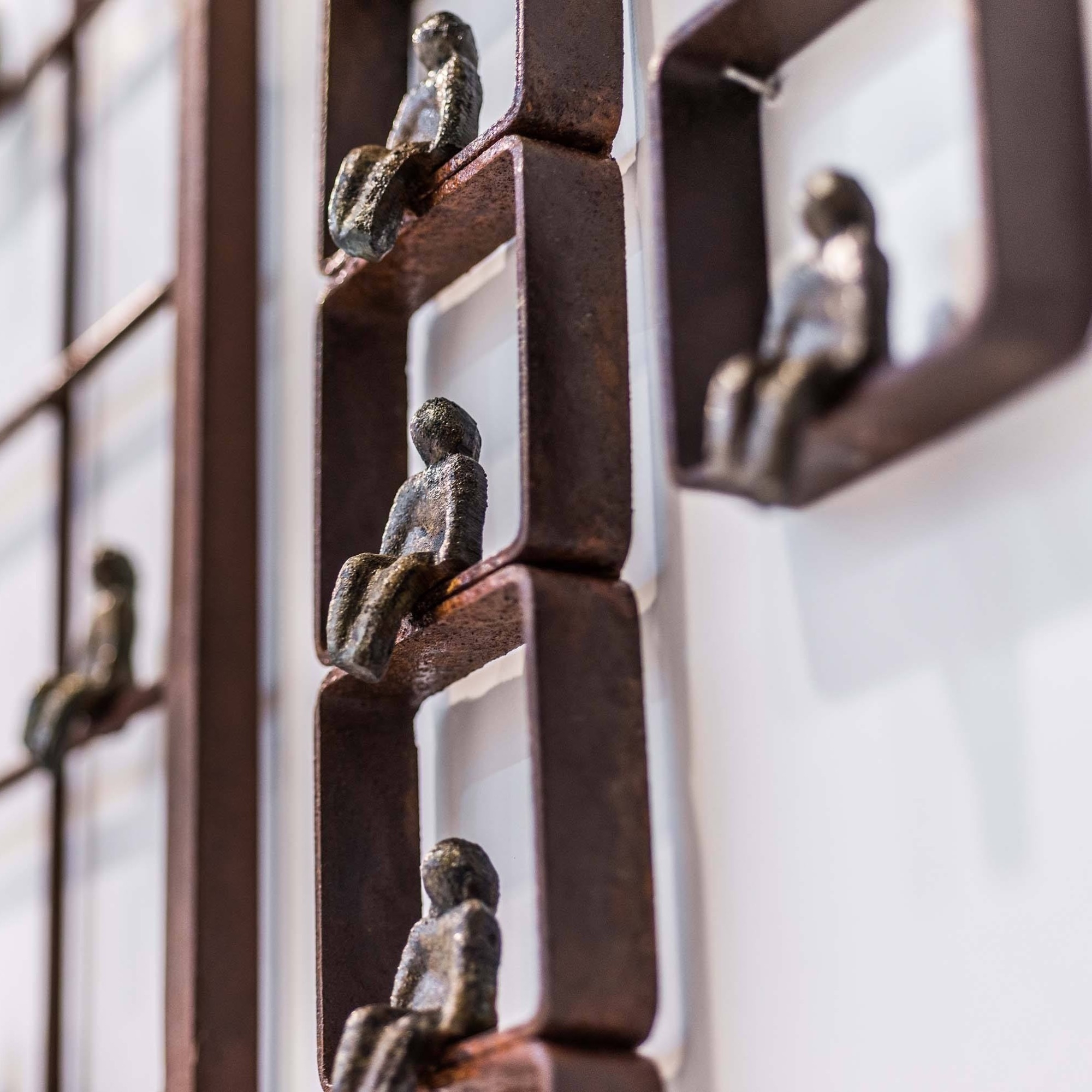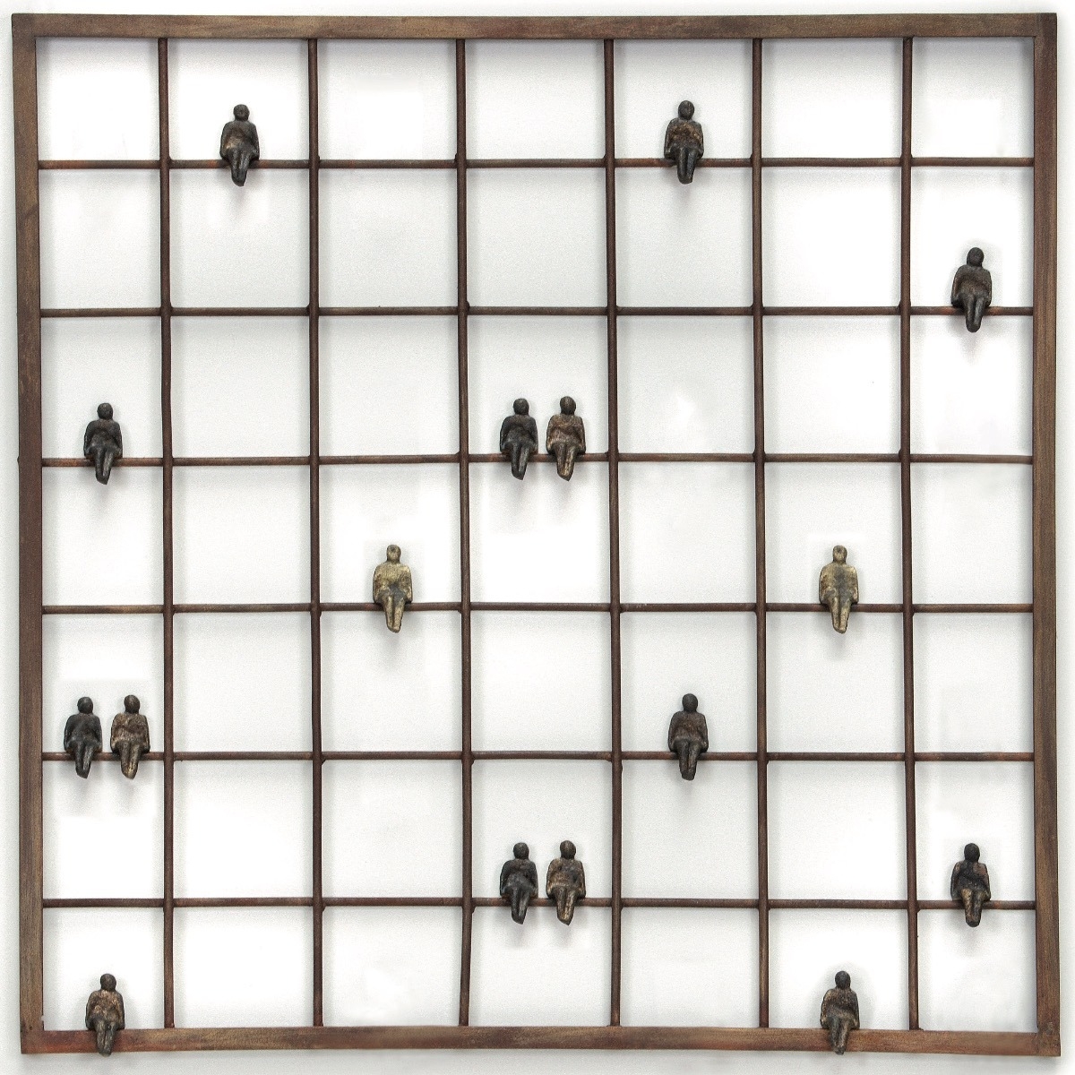 Dieses quadratische Fenster mit vielen kleinen Sprossen beherbergt 15 unterschiedlich patinierte - von grün bis messingfarbend - Menschenfiguren, die ihre Beine baumeln lassen.