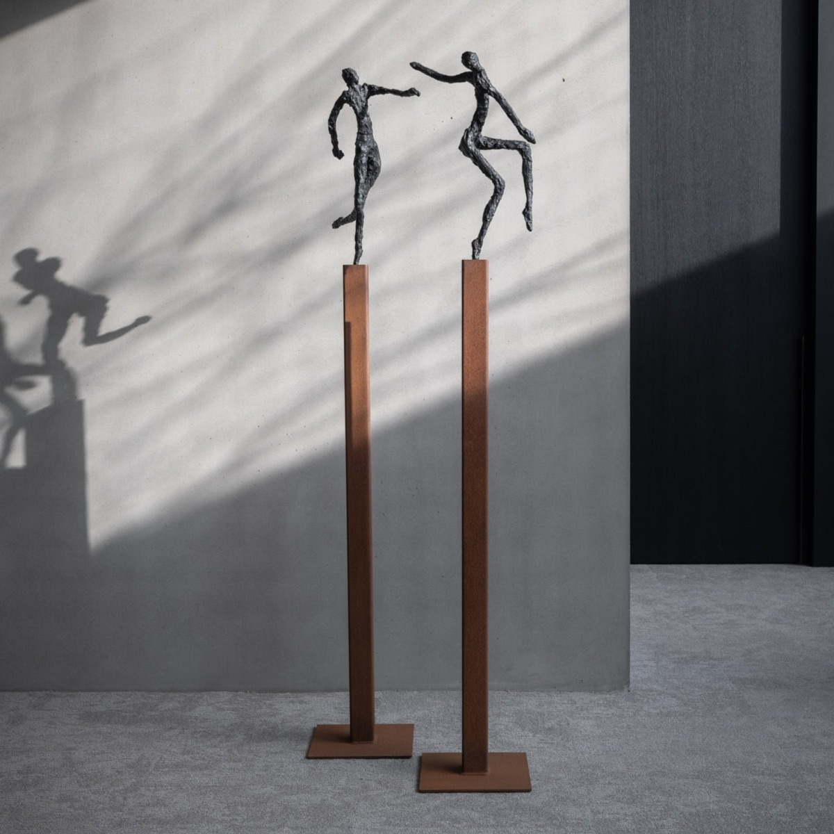 To follow und To guide sind zwei meisterhaft gearbeitete Bronzefiguren von Ann Vrielinck in limitierter Auflage. Wie viele von Vrielincks Werken evozieren auch diese Kunstwerke Themen wie Sensibilität und Vertrauen.