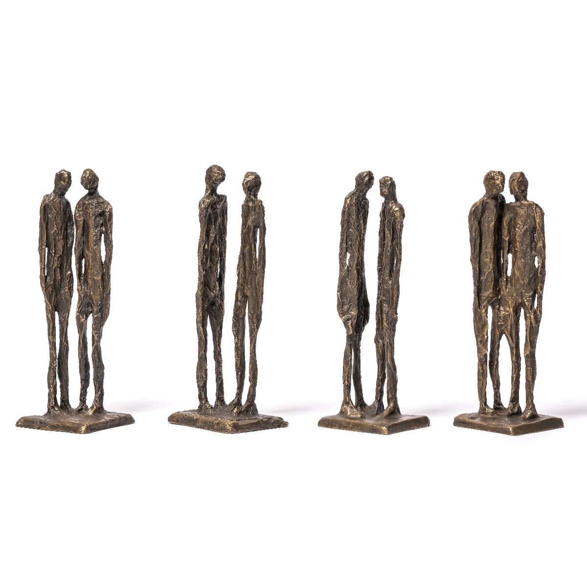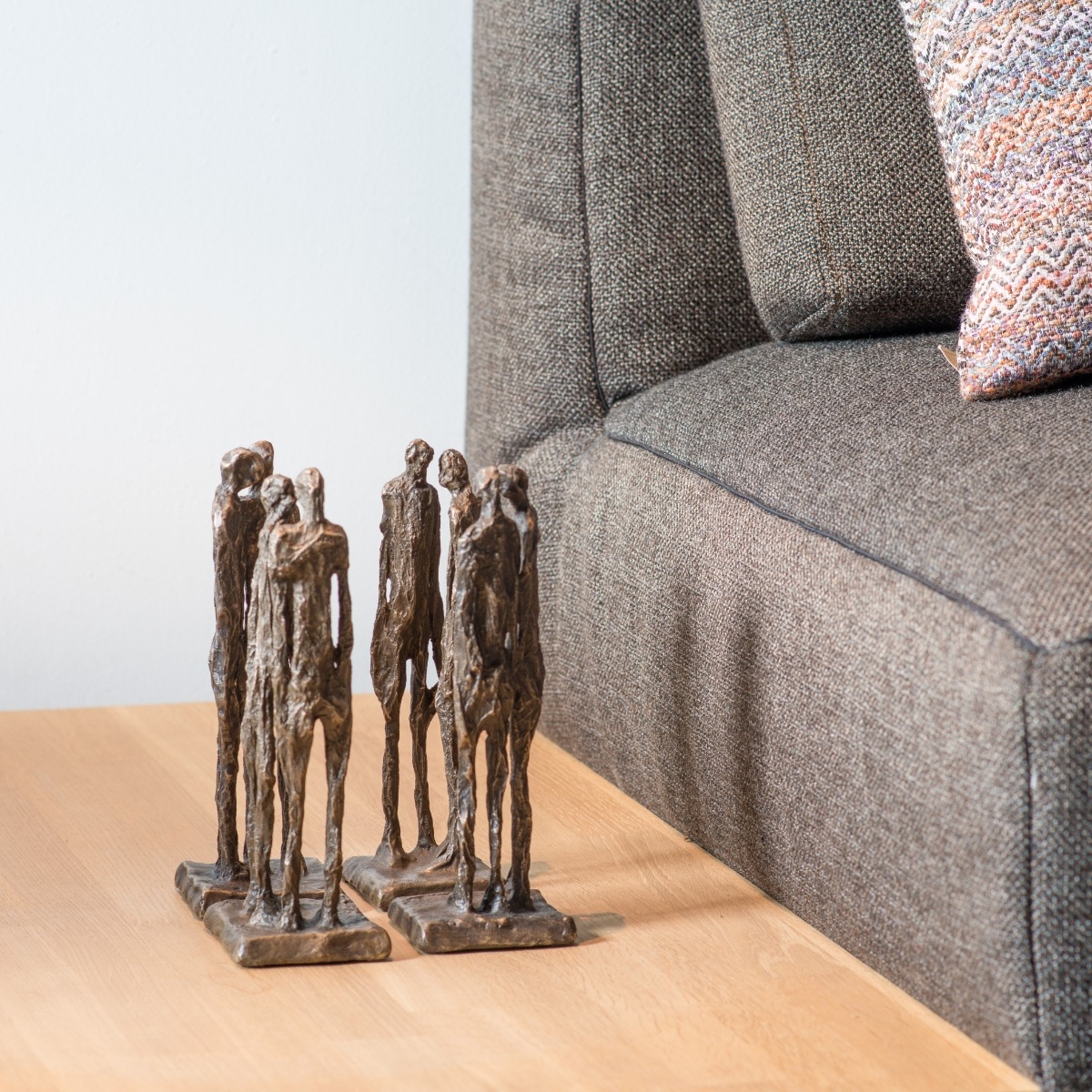 "To Reason" von Ann Vrielinck ist ein vierteiliges Ensemble zierlicher Figuren, die ein Gespräch führen und über ein Thema nachdenken, das dem Betrachter ein Rätsel ist.