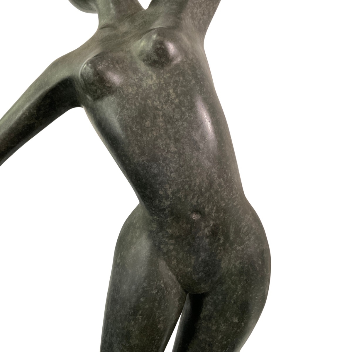 Typisch für die hochwertigen Bronzeskulpturen von Gardeco kann die Figur mit Detailverliebtheit und feiner Ausarbeitung überzeugen. Sie ist dazu auf einem dunkelgrauen Sockel befestigt, der die grazile Haltung der jungen Frau ermöglicht, gleichzeitig aber für einen festen Stand der Bronze sorgt.