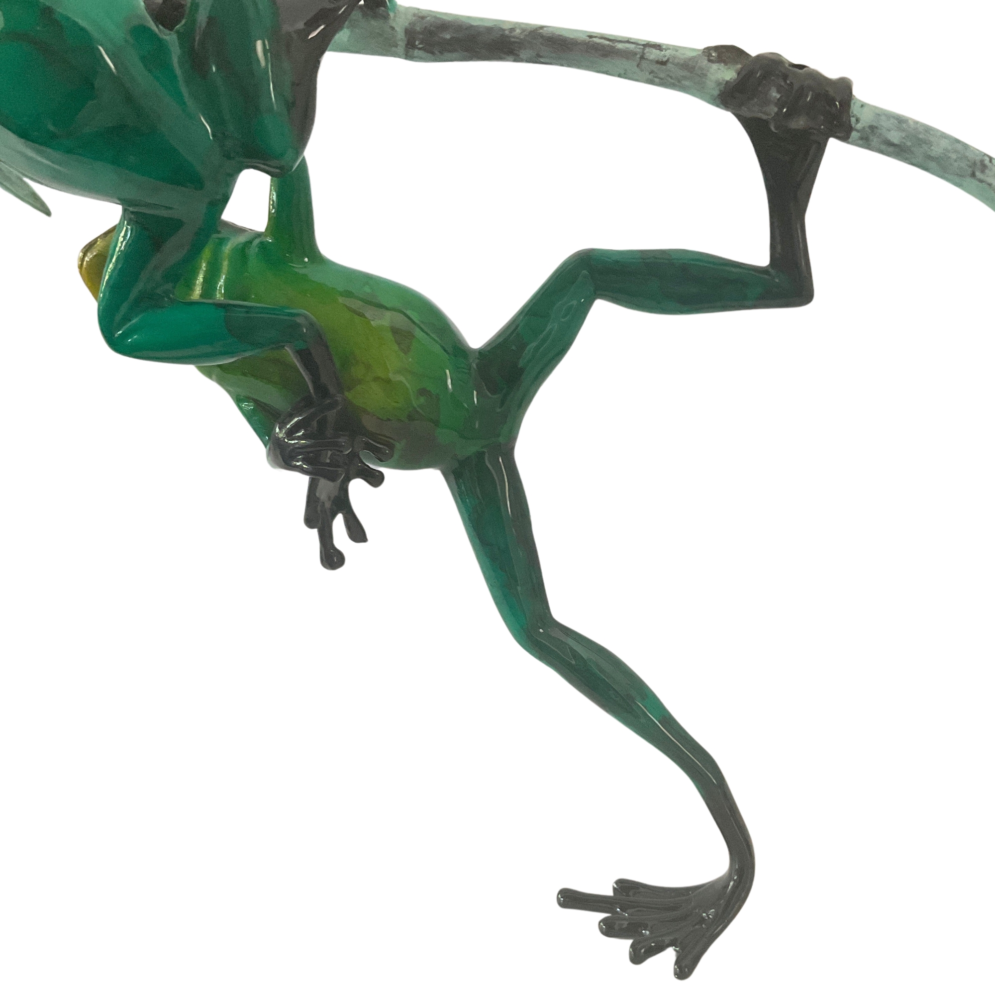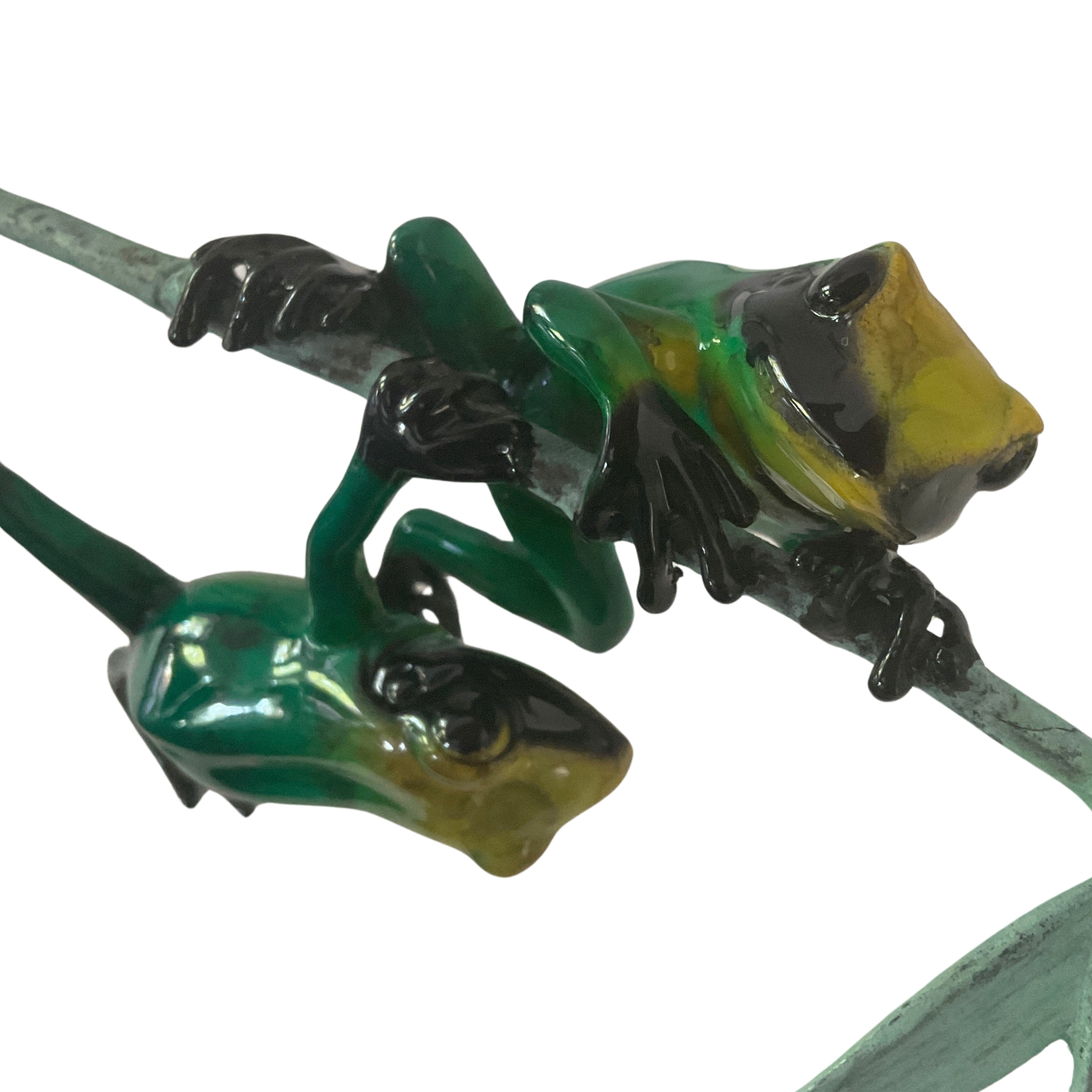 Diese besonders feine Skulptur zweier Frösche, die versuchen, sich auf einem Schilfhalm zu halten, hat viele wunderschöne Details und sticht bersonders durch die glasige, grüne Patina der Frösche heraus. Sie haben vom Körper bis zu den Gliedmaßen einen Farbverlauf von einem leuchtenden grasgrün bishin zu einer dunkleren Färbung, handbemalt und zu 100% wetterfest. Der sich biegende Schilfhalm ist von brauner Farbe mit einer schönen grünen Patina. Die hübsche Skulptur passt dadurch hervorragend zu einem kleinen Teich oder Wasserlauf.