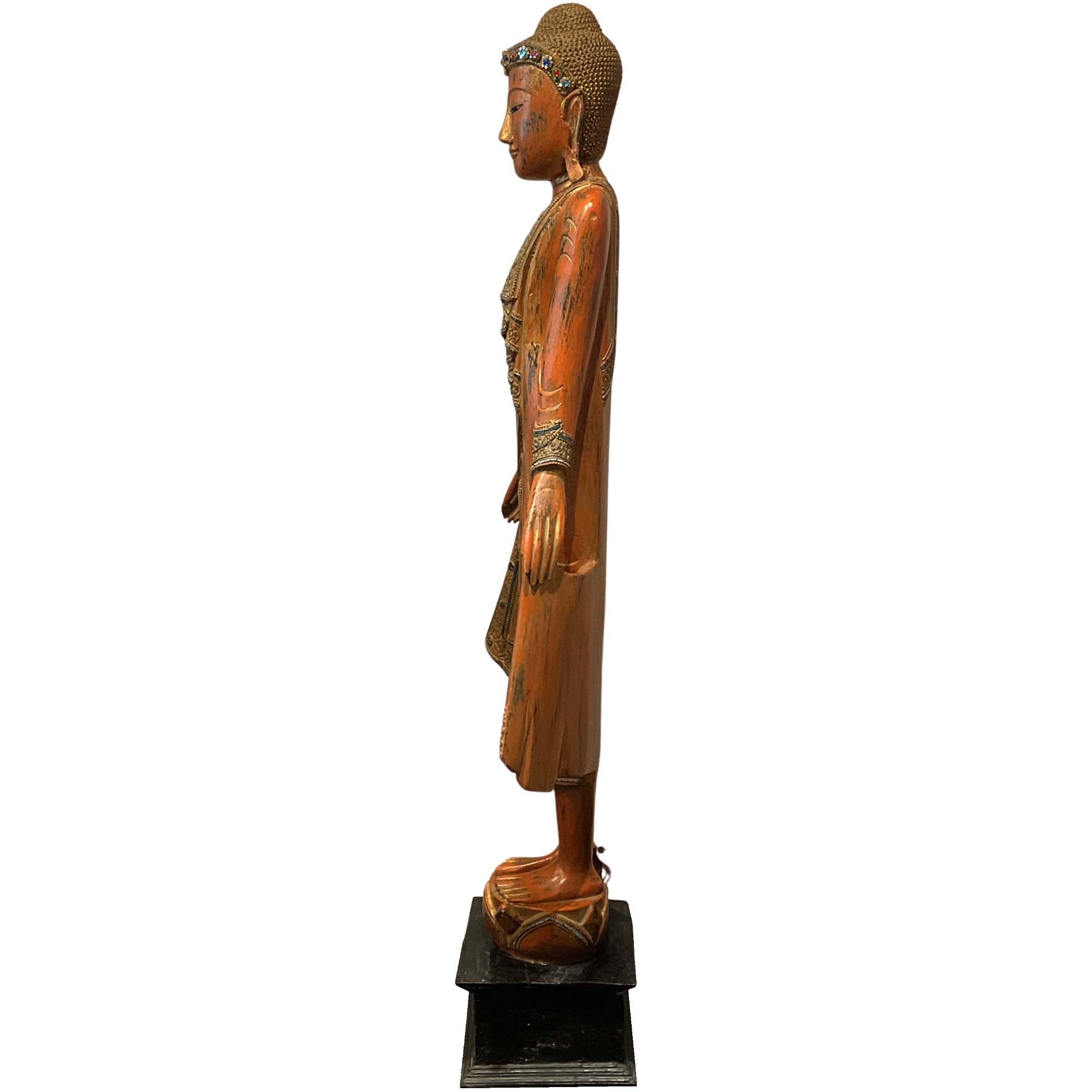 Der Buddha steht auf einem schwarzen Holzsockel, welcher einen stabilen Halt und eine einfache Platzierung gewährt. Er ist reicht mit Spiegelsteinen besetzt und macht so einen edlen Eindruck.
