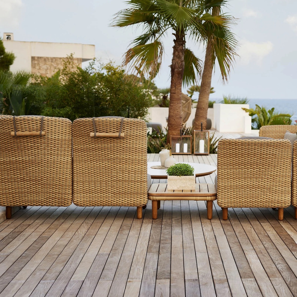 Arch ist flexibel, und die Elemente der Serie lassen sich genau so kombinieren, dass sie zu Ihrem persönlichen Bedarf und Ihren Vorlieben passen. Das Teakholz und das naturfarbene Flechtwerk verleihen dem Design einen einladenden Farbton, der Sie der Natur näher bringt.