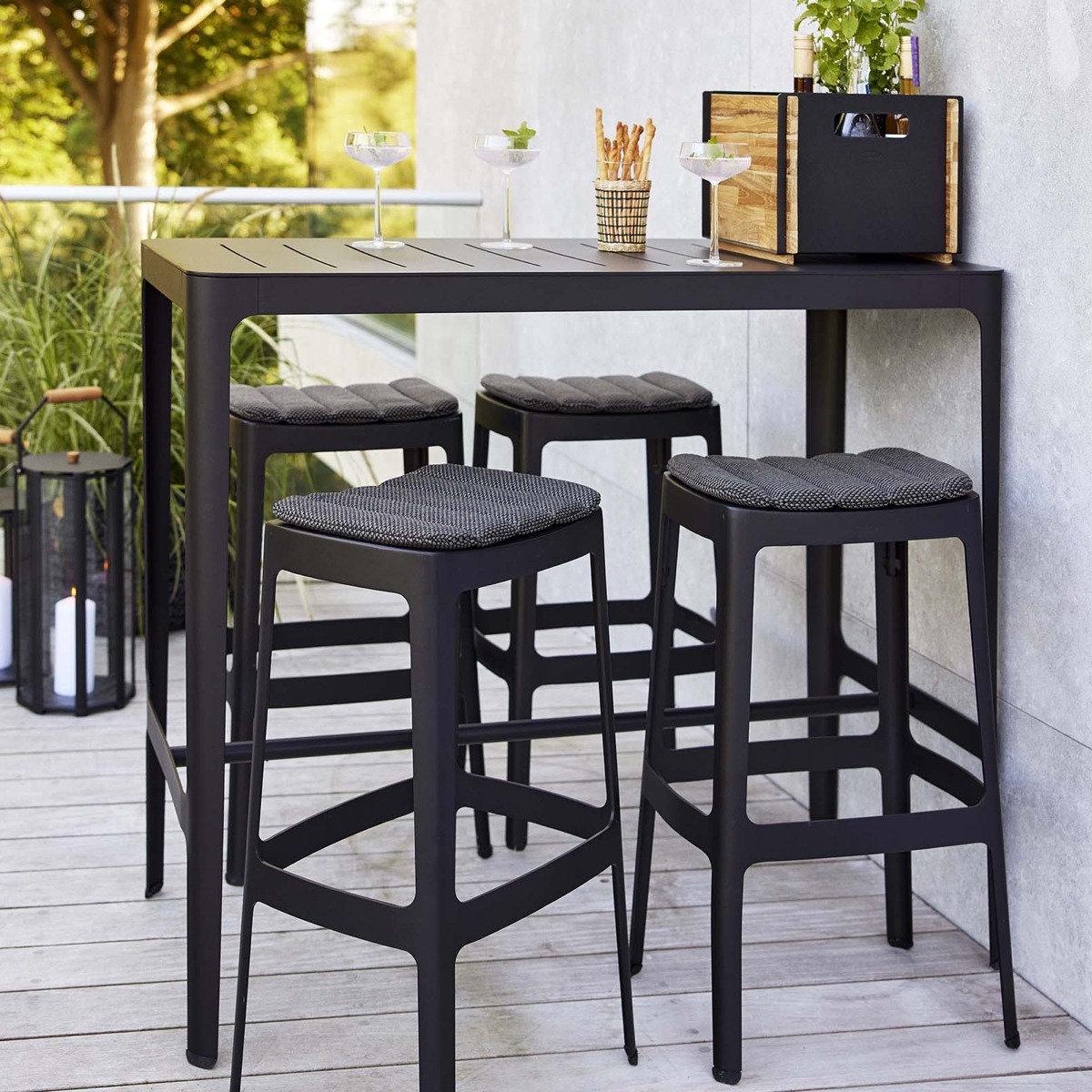 Das Material der Serie Cut, bestehend aus einem hohen Bartisch und Barhockern in zwei Höhen, ist Aluminium, die Farben sind Schwarz oder Weiß. Der Stil ist stramm und hochmodern, ebenso wie die Serie in jeder Hinsicht, von der Materialausnutzung und Produktion bis zu Verpackung und Versand, nachhaltig durchdacht ist.