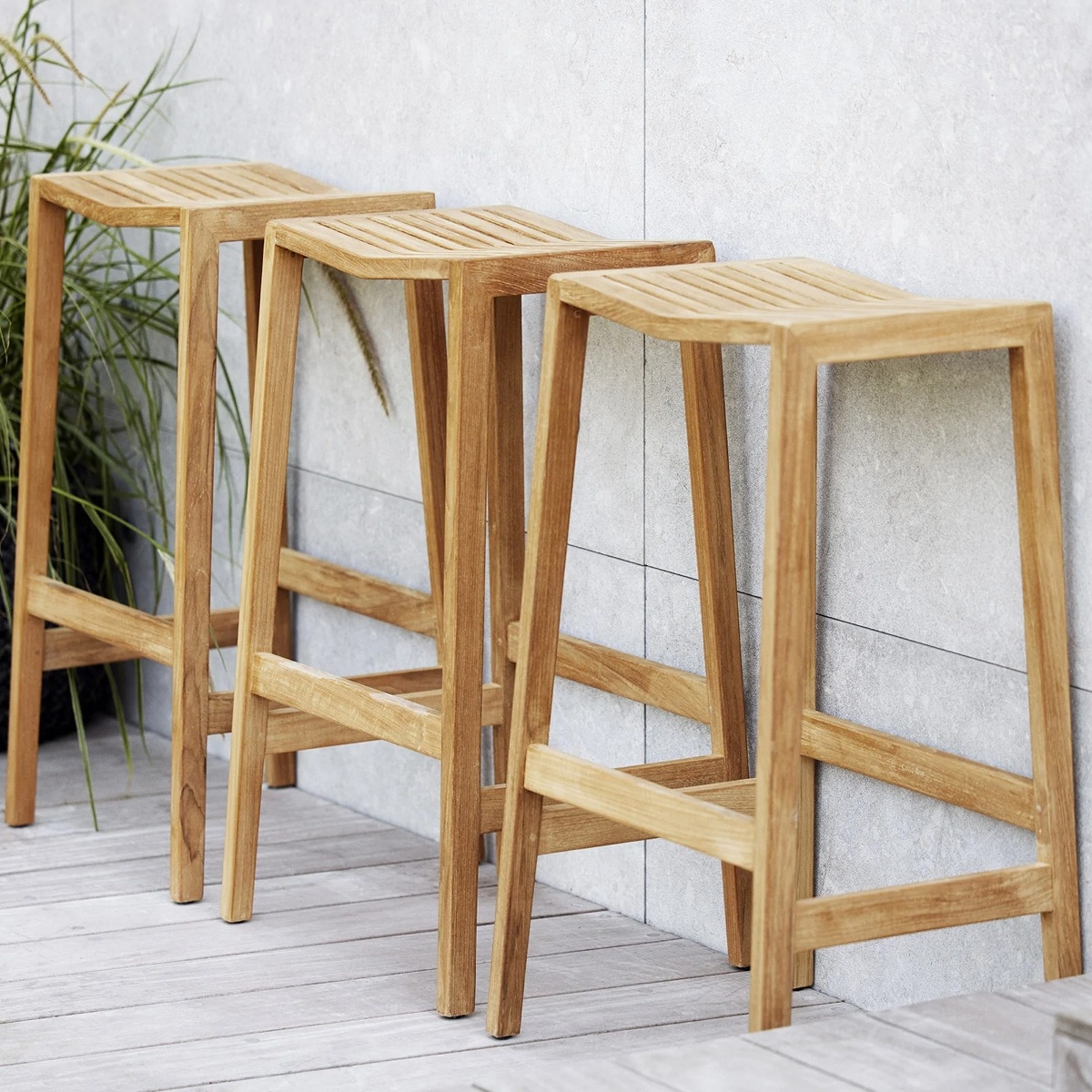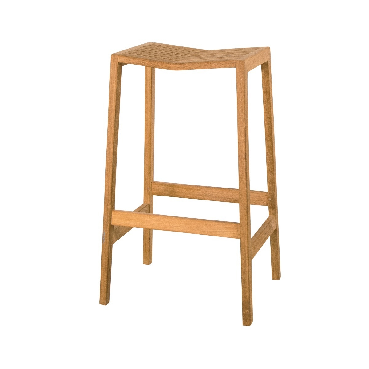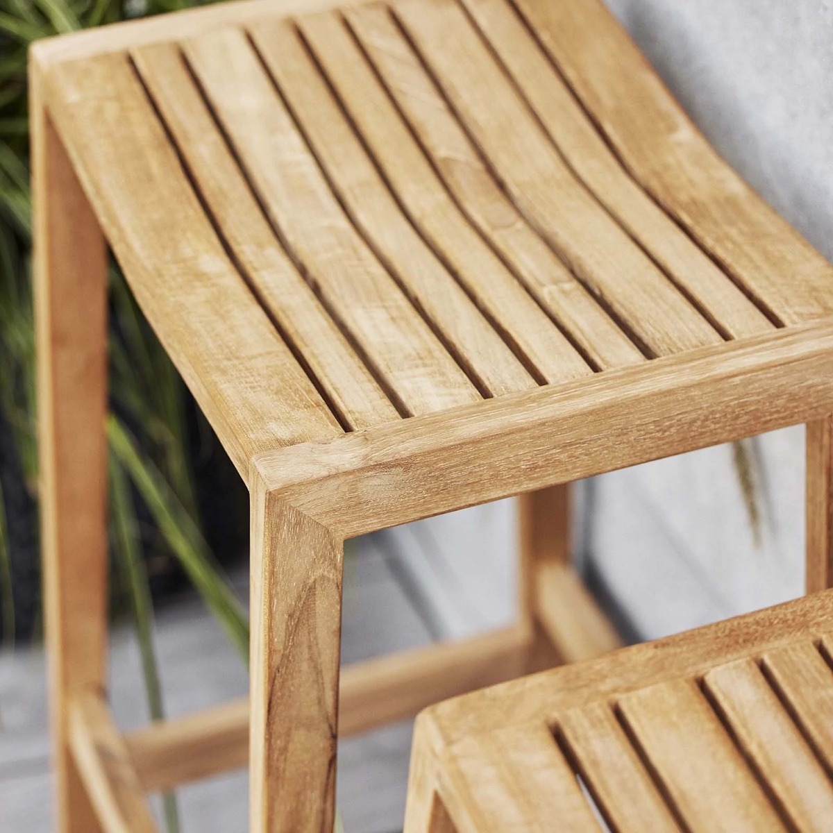 Der Sitz des Barhockers Flip ist leicht geneigt, wodurch guter Sitzkomfort gewährleistet ist. Eine horizontale Teaklamelle bietet Halt für die Füße. Die leichte Neigung verleiht dem Barhocker zudem einen einzigartigen Designausdruck.