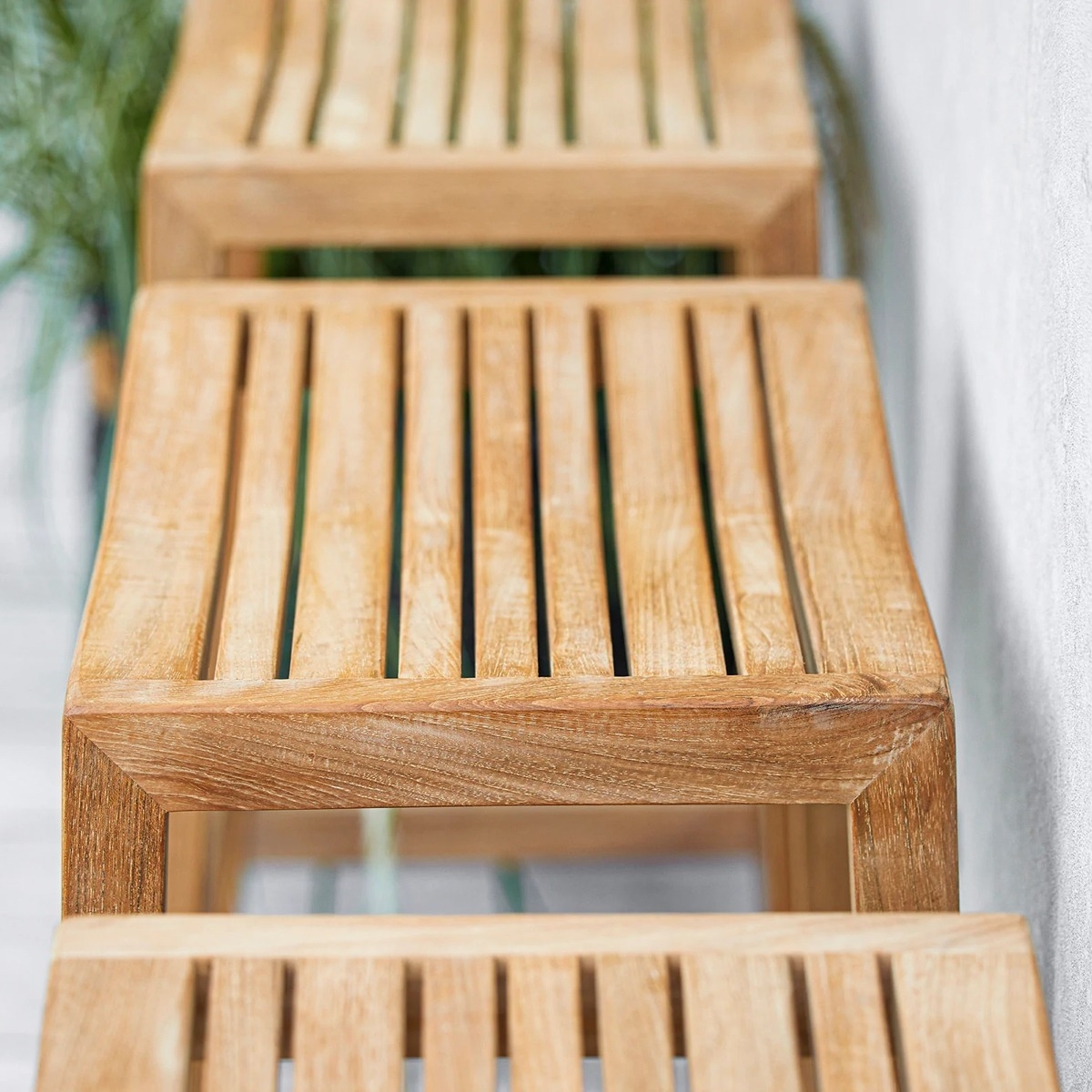 Teak ist eine harte Holzsorte, die sich u.a. aufgrund ihres hohen Ölgehalts besonders für den Außengebrauch eignet. Tischplatten und Möbel aus Teak werden unbehandelt geliefert. Lässt man die Möbel unbehandelt stehen, bildet sich mit der Zeit auf dem Holz eine hellgraue Patina. Soll der warme, goldene Teakholzton erhalten bleiben, empfiehlt es sich, das Holz regelmäßig mit einem geeigneten Teaköl zu behandeln. Beachten Sie bitte, dass Teakholz ein Naturprodukt ist und daher weiter arbeitet. Dies kann zu kleinen Rissen führen, weil das Holz austrocknet, oder Teakstäbe können sich geringfügig verdrehen/anstoßen.