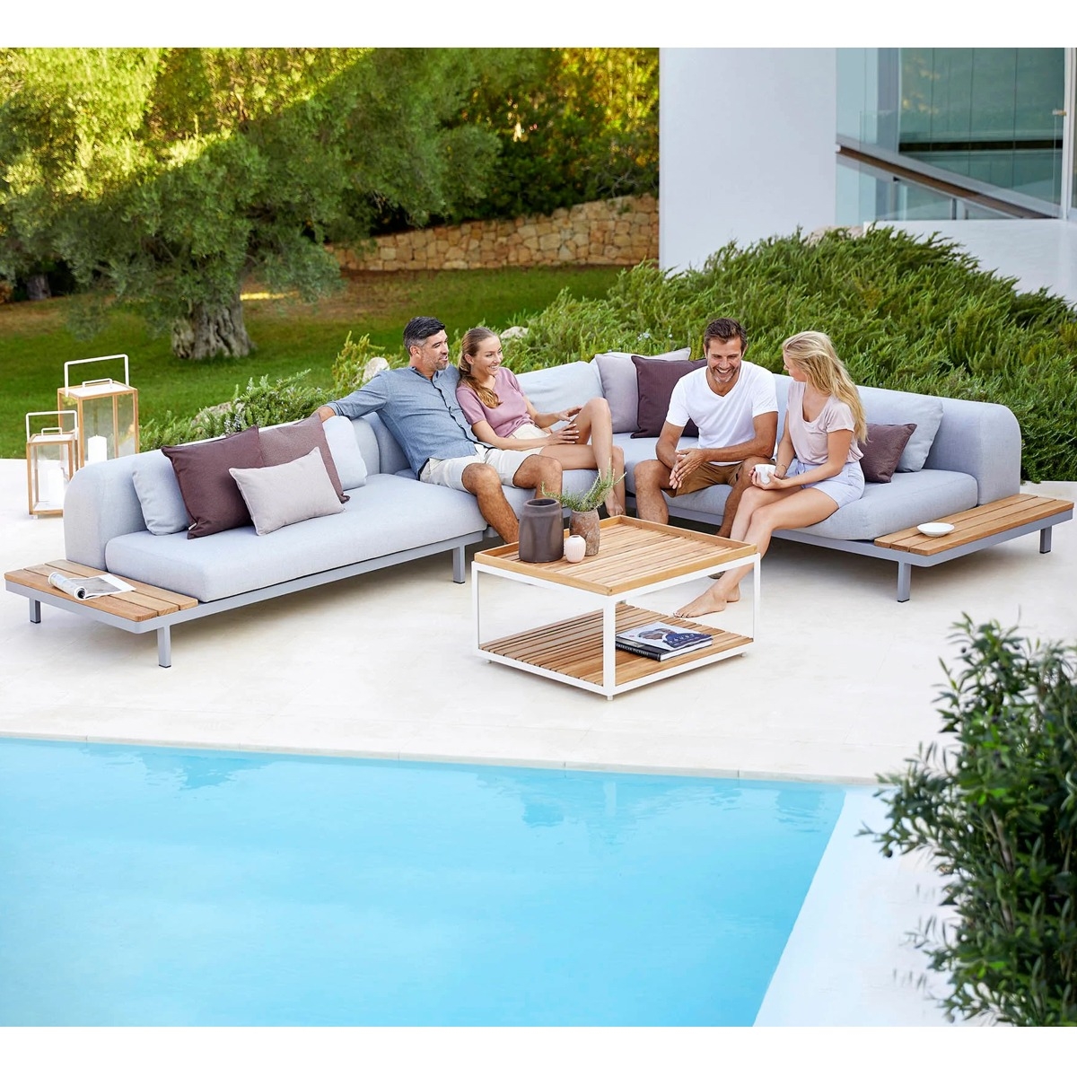 Die Tischplatten sind entweder aus Teakholz oder Solid Surface Material, der Stoff der Kissen ist der weiche und komfortable Cane-line AirTouch Stoff. Das innovative und moderne Lounge-Konzept wurde vom dänischen Designerpaar Foersom & Hiort-Lorenzen MDD entworfen.