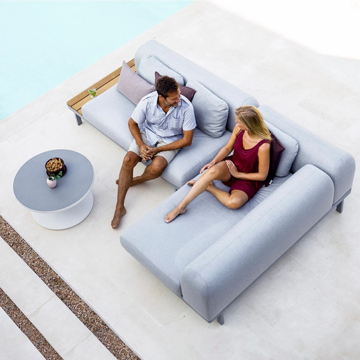 Dieses Konzept eröffnet eine ganz neue Dimension von modularen Lounge-Sofas, bei denen man das Material und die Funktion und damit den Look verändern kann. Space ist ein Lounge Sofa, welches man zu einer Sonnenliege verwandelt kann, indem man die Rücken- und Seitenkissen zu Tischen umwandelt.
