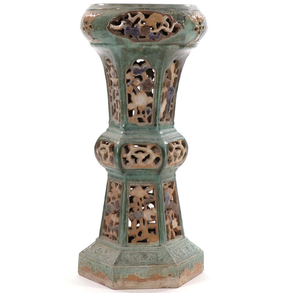 Diese chinesische Keramiksäule aus dem 20. Jahrhundert verfügt über ein mehrfarbiges Durchbruchdekor in verschiedenen Kartuschen. Der hexagonale Stand der Säule mündet in eine runde Abdeckplatte.