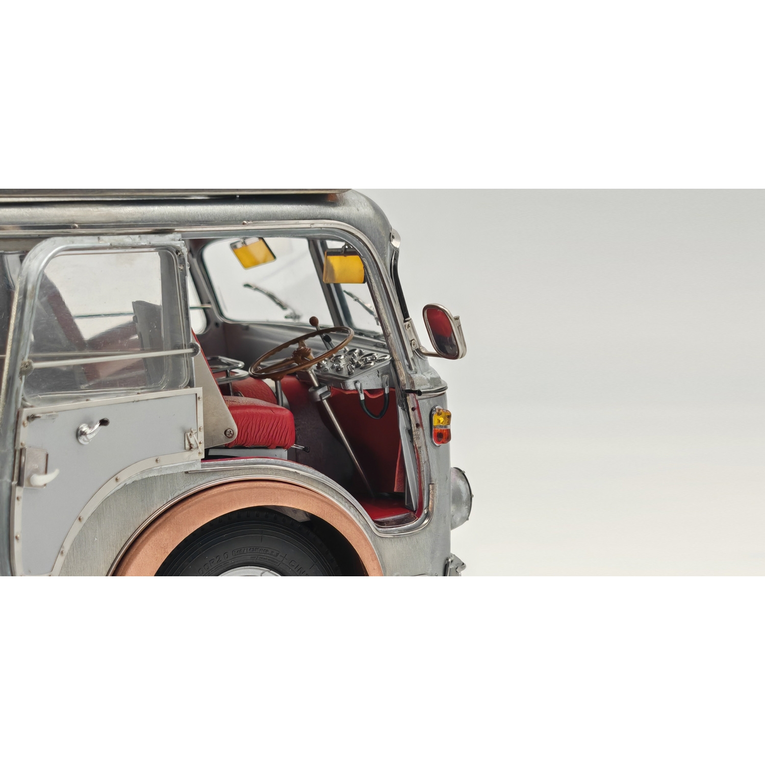 Der Maserati-Renntransporter von 1957 ist ein markanter Auftritt auf jeder Modellfläche – besonders mit drei CMC-Maseratis an Bord. Das rund 50 cm lange Modell besteht aus 2.640 Einzelteilen und überzeugt durch detailreiche Verarbeitung, Zweifarbenlackierung und authentische Beschriftung