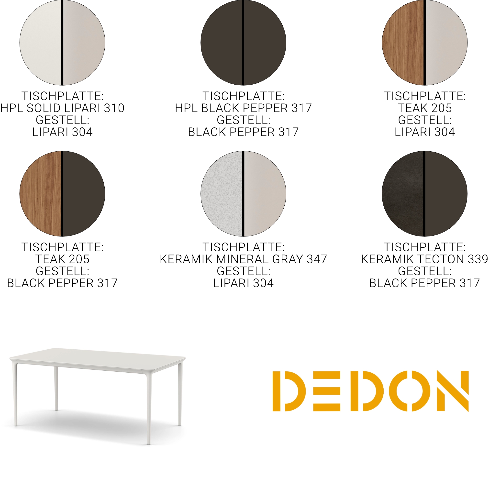 Die Tische sind mit einer HPL Tischplatte, einer Tischplatte aus Keramik oder einer Teakholzplatte erhältlich. HPL ist ein Material, das sich durch hohe Stoßfestigkeit und extreme Widerstandskraft gegen mechanische Einwirkungen, Feuchtigkeit und Dampf auszeichnet. Die DEDON HPL Tischplatten bestehen aus mit Harz getränkten Papierschichten. Da die Papierschichten ein Naturprodukt sind, kann es produktionsbedingt zu gewissen Farbabweichungen kommen. Die Keramik-Tischplatten bestehen aus Feinsteinzeug – einer hochwertigen Hochleistungskeramik, die durch das Sintern von Mineralpulvern ganz ohne synthetische Harze entsteht. Sie zeichnen sich durch eine hohe Widerstandsfähigkeit gegenüber Wasser, Frost, UV-Strahlung und Abrieb aus und sind somit ideal für den Einsatz im Außenbereich geeignet. Der Rahmen besteht aus pulverbeschichtetem Aluminium. Mit einem weichen, sauberen Tuch und warmem Wasser reinigen. Die Teakholzplatte besteht aus hochwertigem Teakholz. Reinigen Sie das Teakholz mit DEDON Faser, Teak & Polsterreiniger. Um den ursprünglichen goldbraunen Farbton zu bewahren, tragen Sie mindestens alle sechs Monate die DEDON Teak Pflege auf.