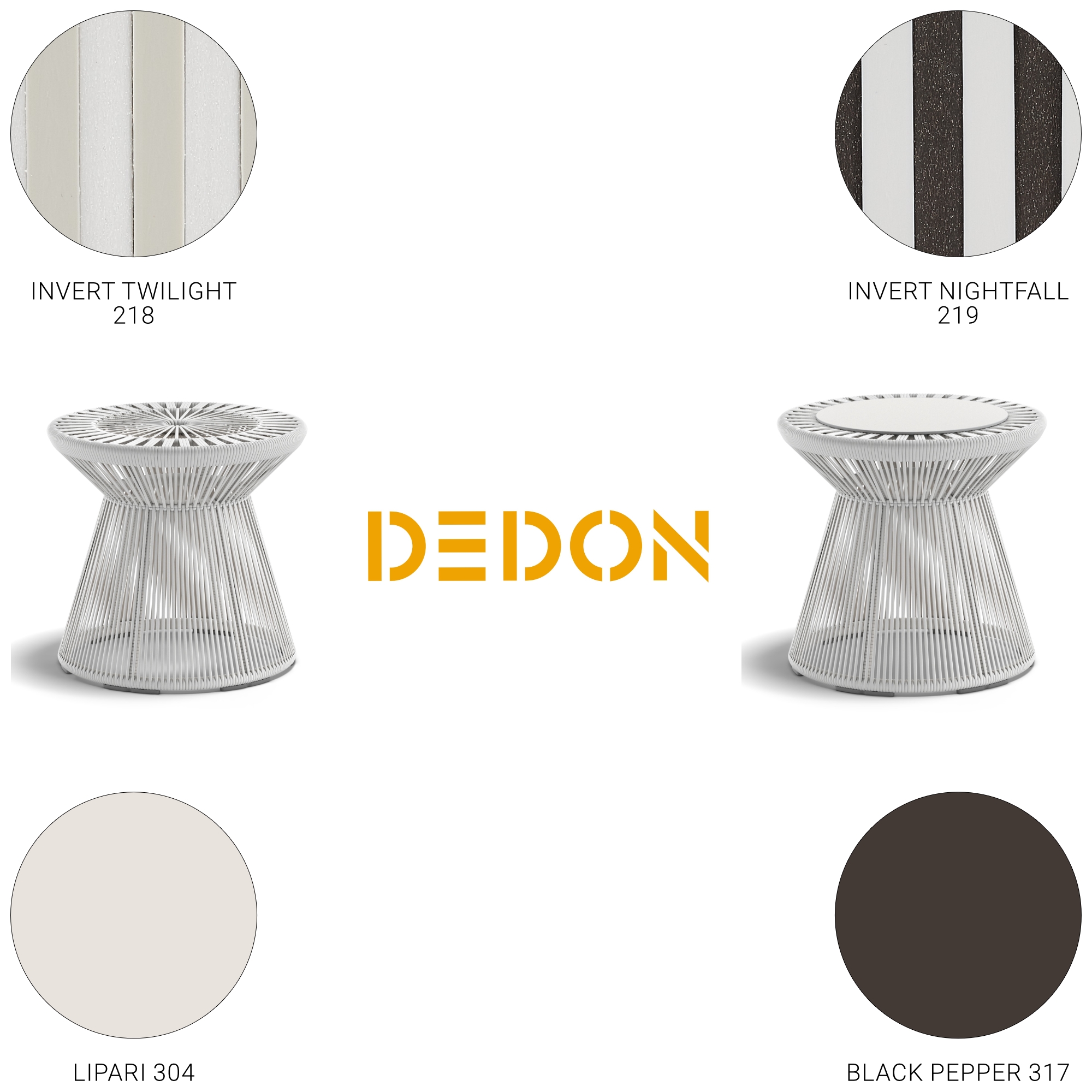 Hergestellt aus DEDON invert Faser, die über einen pulverbeschichteten Aluminiumrahmen geflochten ist. Die DEDON invert Faser wird im Co-Extrusionsverfahren hergestellt, einem Prozess, bei dem zwei verschiedene Faserfarben und Arten in einem Strang kombiniert werden. Mit einem weichen Tuch und warmem Wasser reinigen.