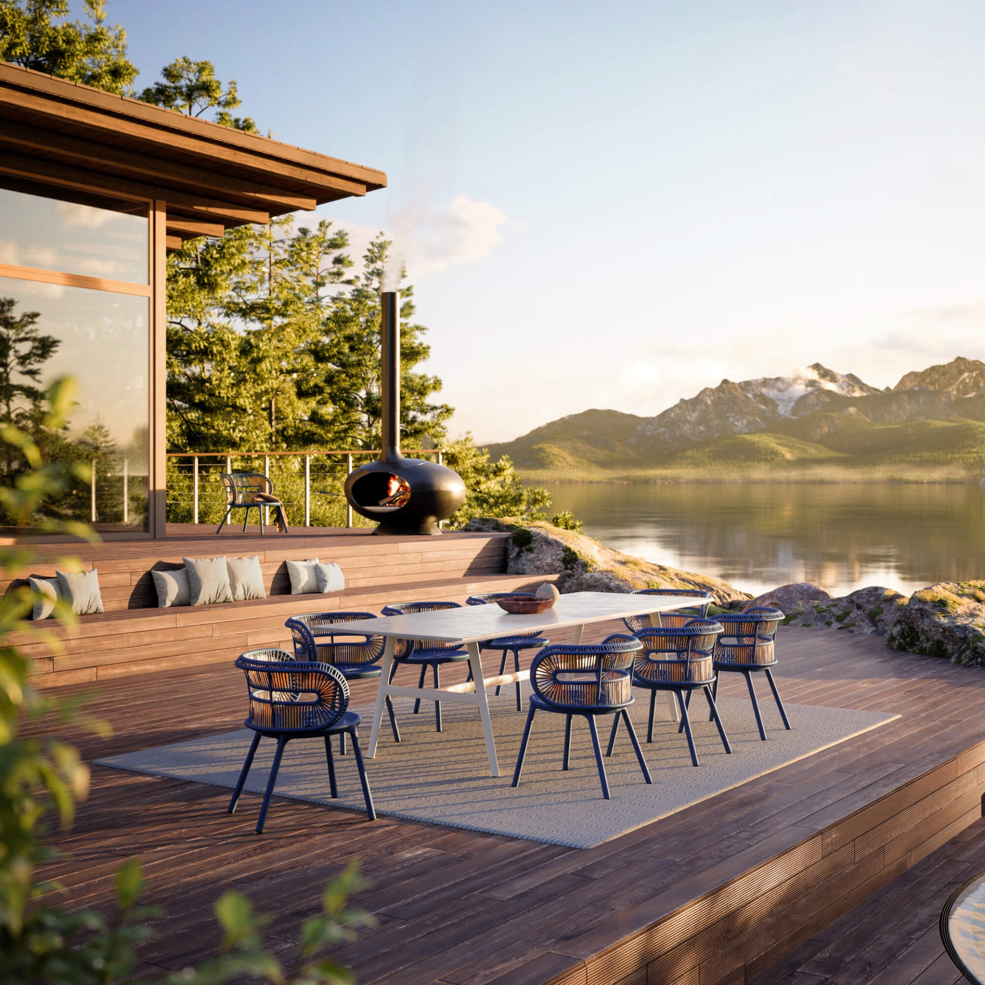 - Erhältlich als Stuhl, Sessel oder Beistelltisch, optional mit Fußhocker und Kissen