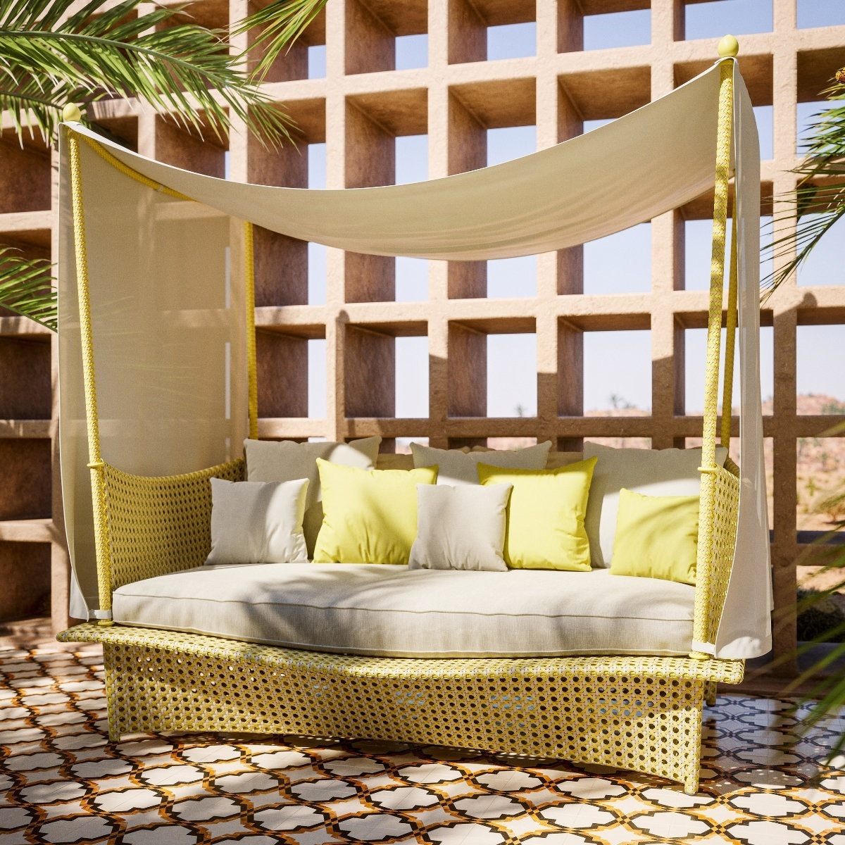 Originell, temperamentvoll und charmant: DAYDREAM ist die reine DNA von DEDON und verleiht jedem Ambiente, ob drinnen oder draußen, Charakter. Mit seinen geschwungenen Linien, dem Wiener Rohrgeflecht und den großzügigen Proportionen eignet sich das Himmelbett perfekt, um allein oder zu zweit ein Buch zu lesen, an einem Glas zu nippen, sich zu unterhalten, zu plantschen oder in Träume zu versinken. Mit ihrem eleganten Sitz, der Seitenlehne, der Rückenlehne, den Stangen und dem Baldachin bringt die äußerst bequeme Liege einen Hauch von Fantasie in jede Gartenumgebung.